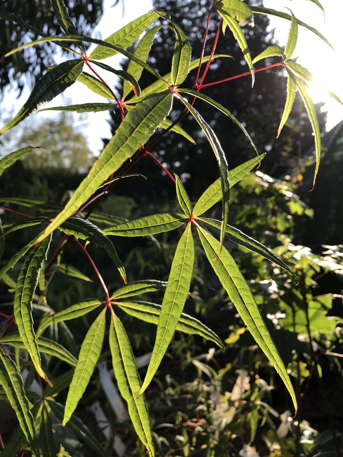 One of the most attractive of all maples yet critically endangered in its wild home, where there is just one small population left in W. Sichuan, China. The extremely beautiful leaves, on long slender scarlet petioles, are uniquely fully divided to the base with five very slim, linear-lanceolate segments, green above and pale glaucous beneath. Can take at least -10c.