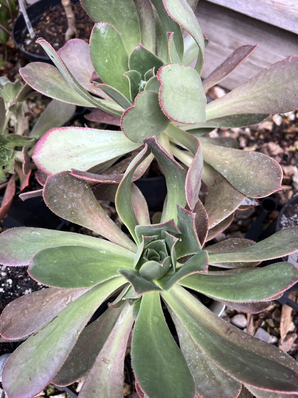 An extremely variable species from La Palma, Canary Islands; the largest forms are capable of reaching 1m high and with rosettes to 30cm across. This particular clone appears to be at the mid to larger end of the scale with grey-green leaves tinged purple in good light and capable of forming strong upright stems, but still bushy and well branched. For a frost free location over winter, this loves to spend summer outside (or even winter too if v mild. Conical heads of white flowers produced when a stem has reached maturity.