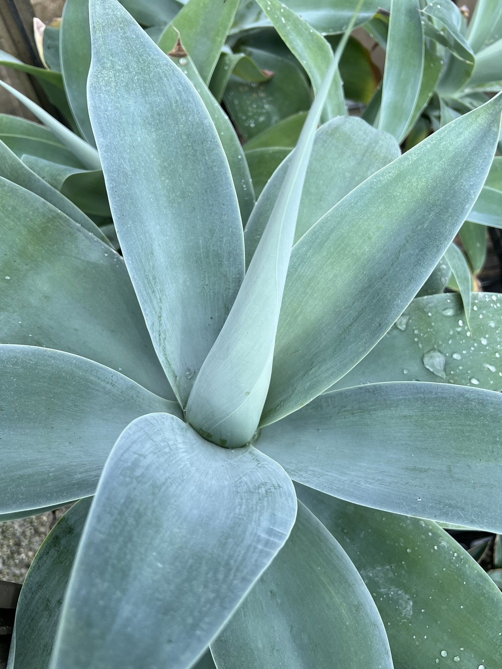 One of the blue-grey forms of the species, selected in California, very rarely seen in the UK. One of the most beautiful of all succulents and great for people who don't enjoy impaling themselves on vicious thorns, as this Mexican cliff dweller doesn't have any. Extremely beautiful rosettes of long tapered, soft, flexible blue-grey leaves up to about 1m across are possible if grown in a large pot, but can be kept much smaller. A gem for the frost free conservatory or sunny large window, inside or out in summer.
