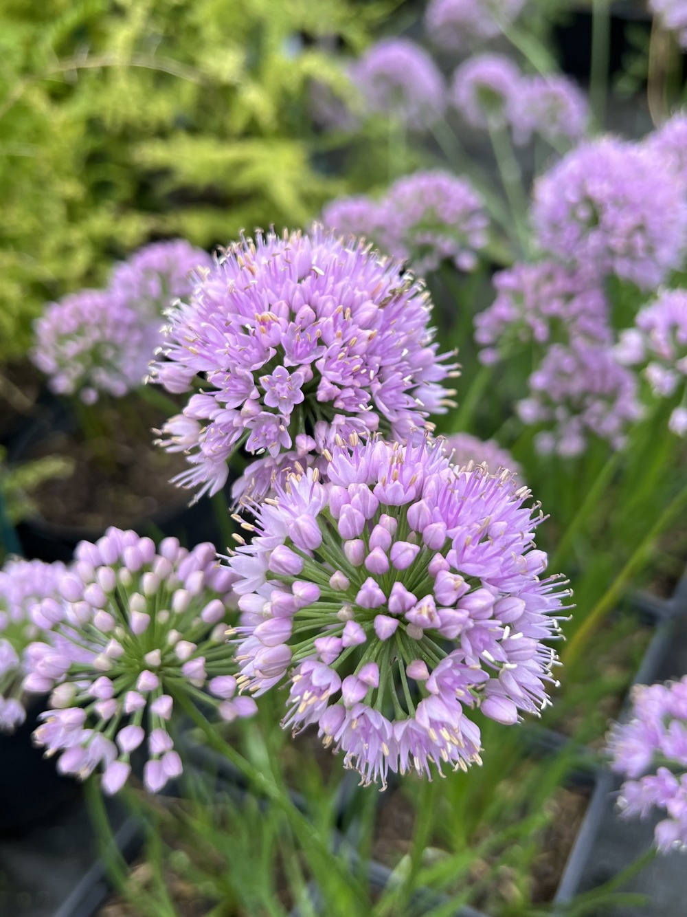 A late summer flowering dwarf Allium, with masses of pale mauve flowers in perfectly round heads to 6cm across, on stems to 38cm tall from August to Sept. Easy and hardy, this bulks up well. For any reasonably drained soil in sun or part shade. Very attractive to bees.