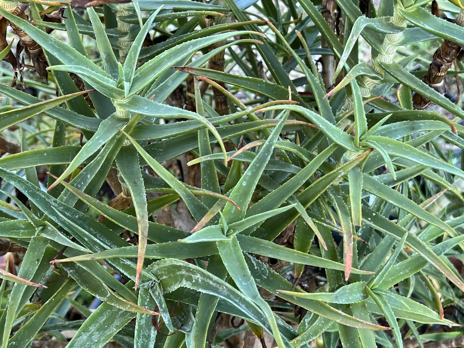 The strictly high altitude, greyer leaved and hardier variety from around Molteno in the E. Cape, proven hardy on the Continent to below -10c for short periods. Easily growable outside throughout much of the UK in a sunny, very well drained spot. Usually completely hardy, this can be cut back by rare extreme winters, though usually re-grows strongly from the base. Multi-stemmed to 1.5m, topped by yellow Kniphofia-like flowers with orange anthers in July over the succulent grey-green leaves. Very rare in the UK.