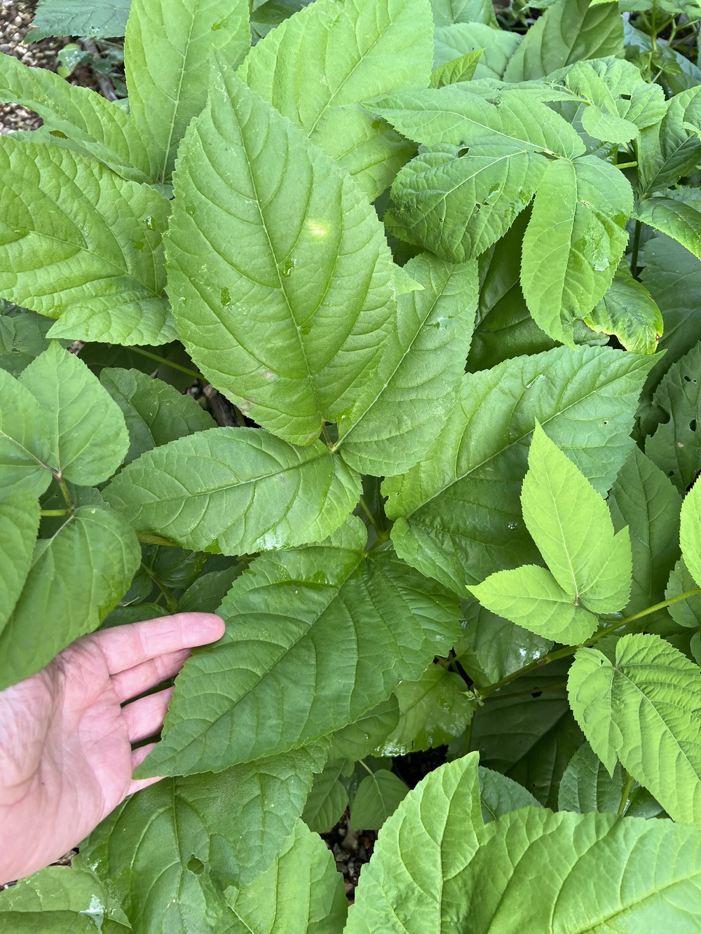 A large imposing hardy herbaceous perennial from the Far East, rarely offered in the UK, with layers of horizontally held big, bold, bipinnate, deciduous leaves composed of multiple broad leaflets topped by 50cm long racemes, composed of multiple rounded heads of pink flowers July-August, followed by purple-black berries in autumn. Height to 2m. The parents of these plants were originally collected in S. Korea. Tough, very hardy and easy, reaching maximum size in decent soil, not overly dry. Sun or semi-shade.