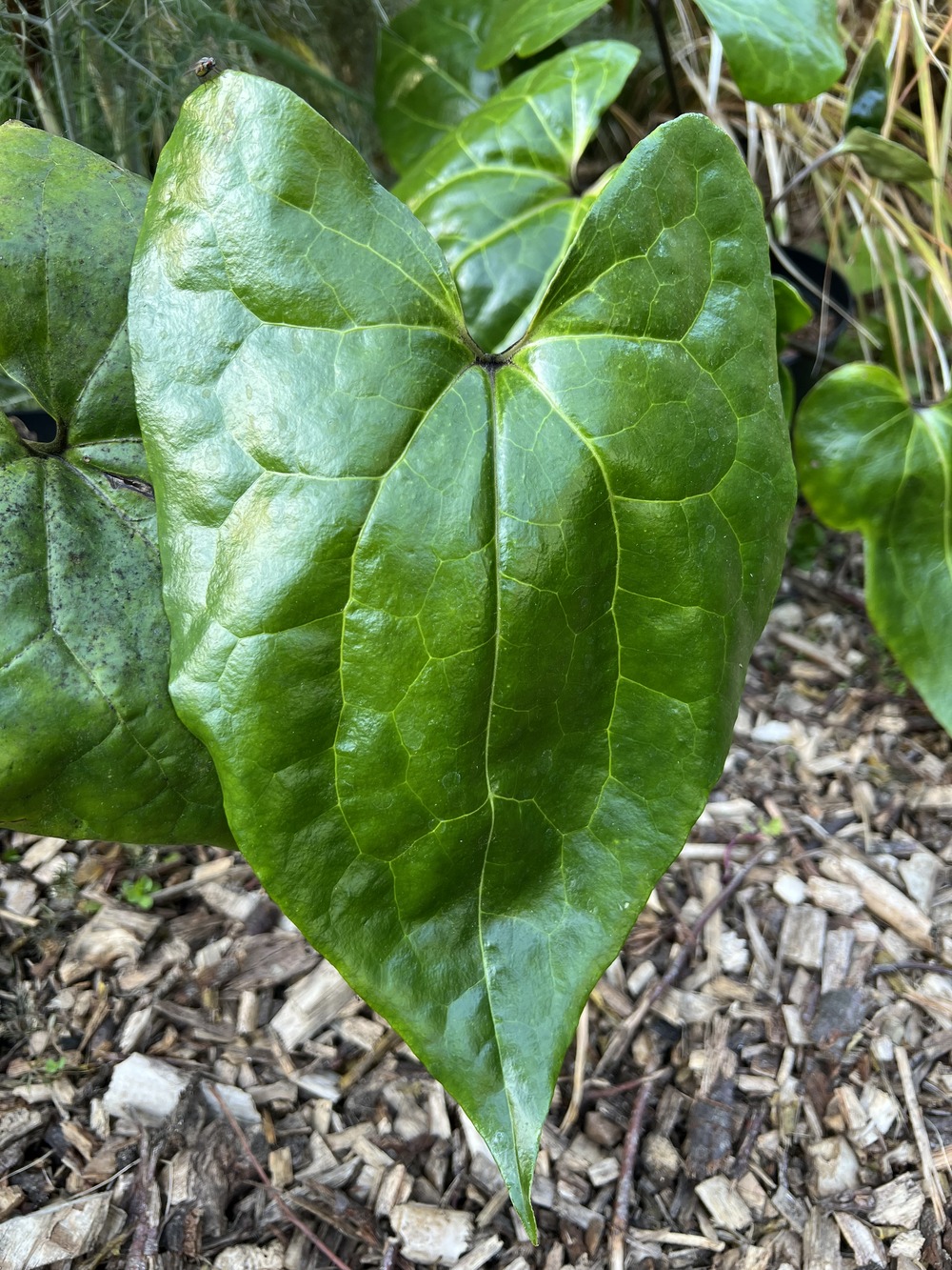 An, errr, seductively named selection of this giant evergreen Chinese species from Tony Avent, with huge glossy, thick textured, heart shaped foliage up to a whopping 28cm long, though usually a fraction smaller. Sinister flowers at ground level in mid to late spring are up to 10cm across and coloured black-purple with tiny yellow specs, with a bicoloured pink and deep-purple eye. Fully hardy, this requires humus rich soil in semi to full shade.