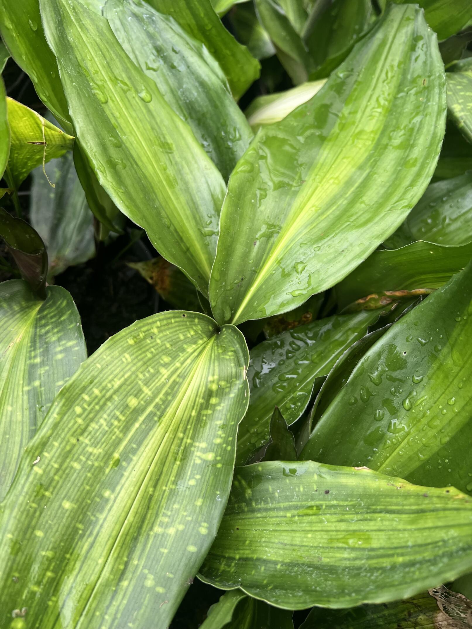 A low-growing broad-leaved Chinese species with slightly undulate-edged leaves 20 x 8cm on 15cm petioles and in this form with pale-yellow speckling and a central zone of pale longitudinal streaking. For dry shade. Exact hardiness unknown as yet but very tough here in a cold polytunnel, even through intense cold. A tough houseplant also, coping well with low light.