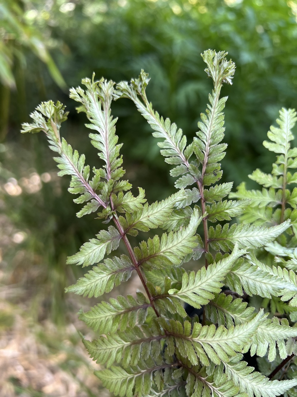 A form of the classic Japanese painted fern with the usual silver-grey and mauve-purple colouring, but with the ends of the fronds and some pinnae crested. Best in a semi-shaded site in leafy soil, not too dry, where it will spread slowly. Height 35cm.