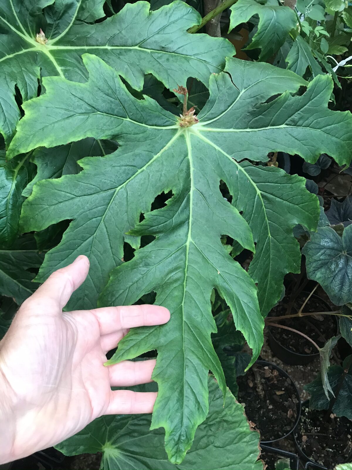 A new species, very recently described, though originally found by Kingdon Ward in Manipur. One of the most splendid foliage Begonias with very large, palmate, heavily dissected leaves on red spotted petioles. Pink flowers in late summer/autumn. Makes a very bold clump up to 50cm high by 75cm across. Proven hardy to under -10c recently on Vancouver Island and hardy here so far, but safest with a mulch over winter.