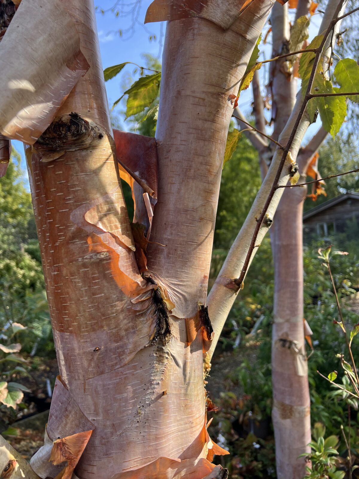 Selected for its outstanding dusky-pink bark, overlain with a persistent transparent layer of white betulin, the whole appearing pale pink. A relatively new selection of this marvellous Chinese birch, making a fast growing medium sized tree. Most effective as a close group of 3, but just one is beautiful. Hardy and easy. Originally from seed sent from Gansu, China.