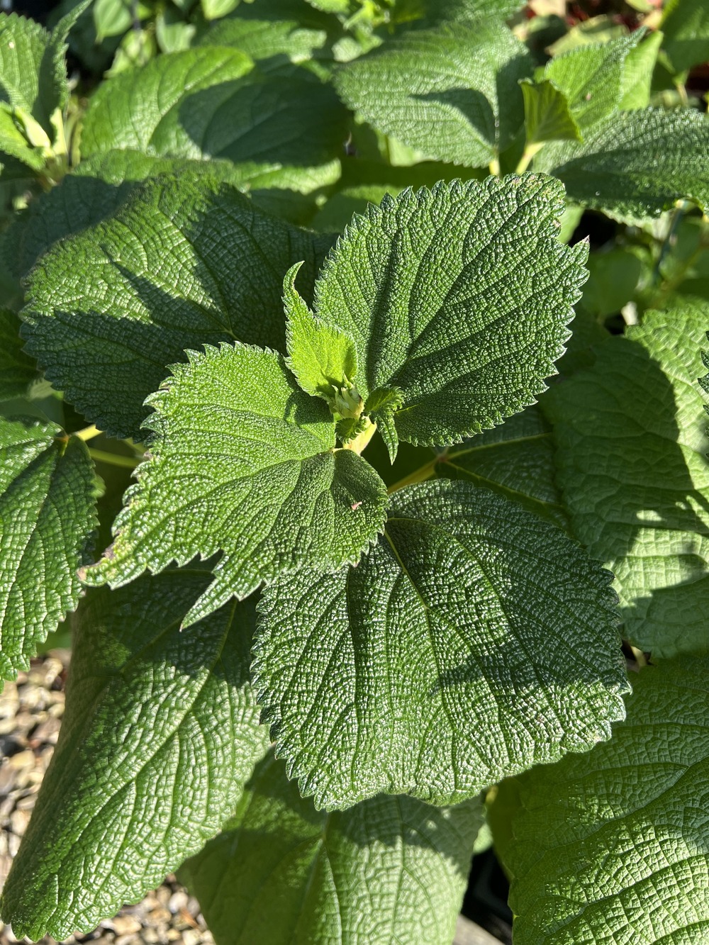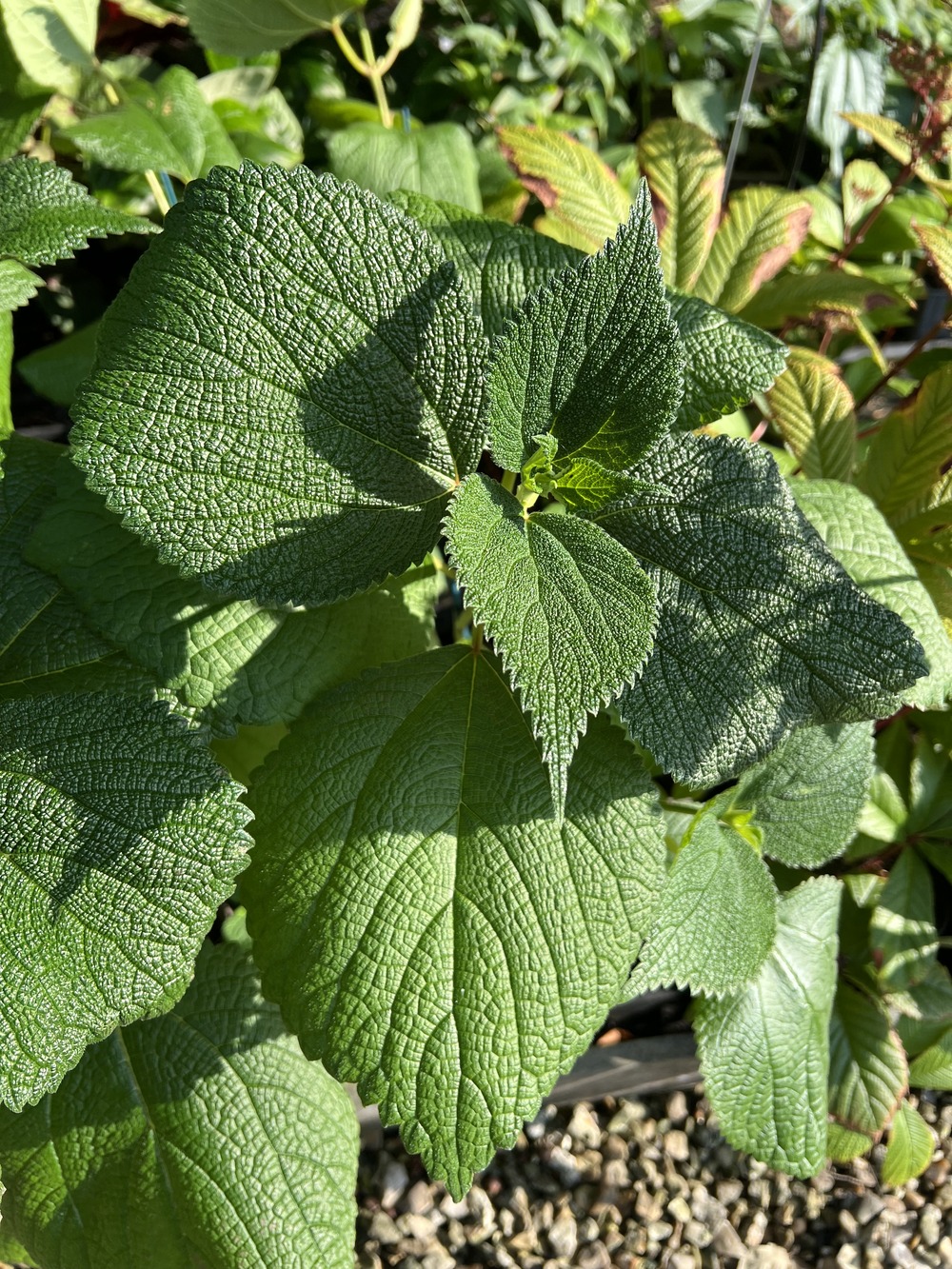 A fully hardy false nettle from Asia with potentially large and particularly well textured (non-stinging) foliage with a serrated edge; the surface being bullate, with deeply impressed veins; rough to the touch. A splendid foliage plant with an exotic look, making a good clump of strong stems up to about 1.5m high and suited to humus rich soil in semi or full shade, not too overly dry.