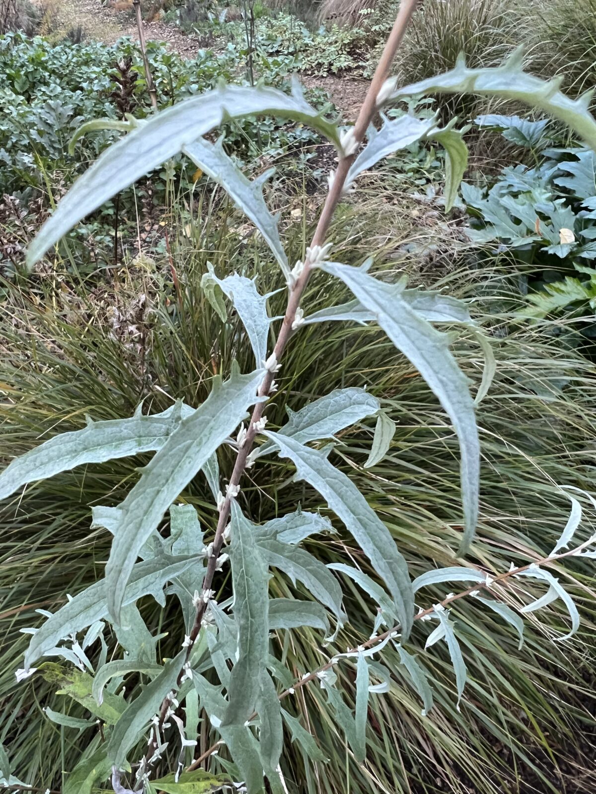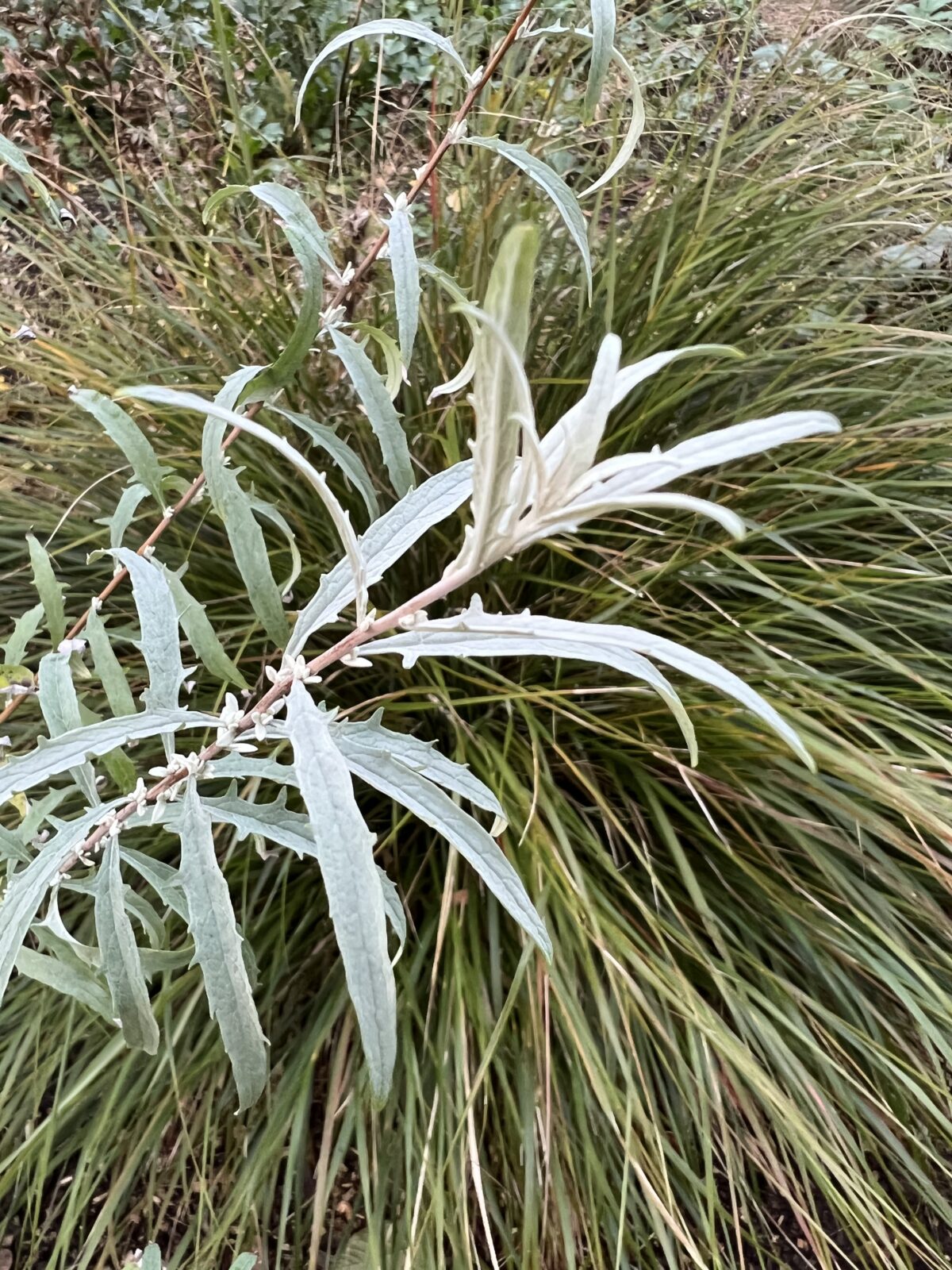 Relatively new to cultivation, a collection by Keith Rushforth from 3000m alt' in Tibet. Thought by some to be a hybrid of B. alternifolia and B. crispa, this forms a twiggy round headed small tree or shrub to 5m if left unpruned, though can be kept much smaller. Pale grey, small, slim, distinctly toothed foliage on wiry branches with axillary clusters of white, fragrant flowers with soft-orange tubes in April. Hardy.