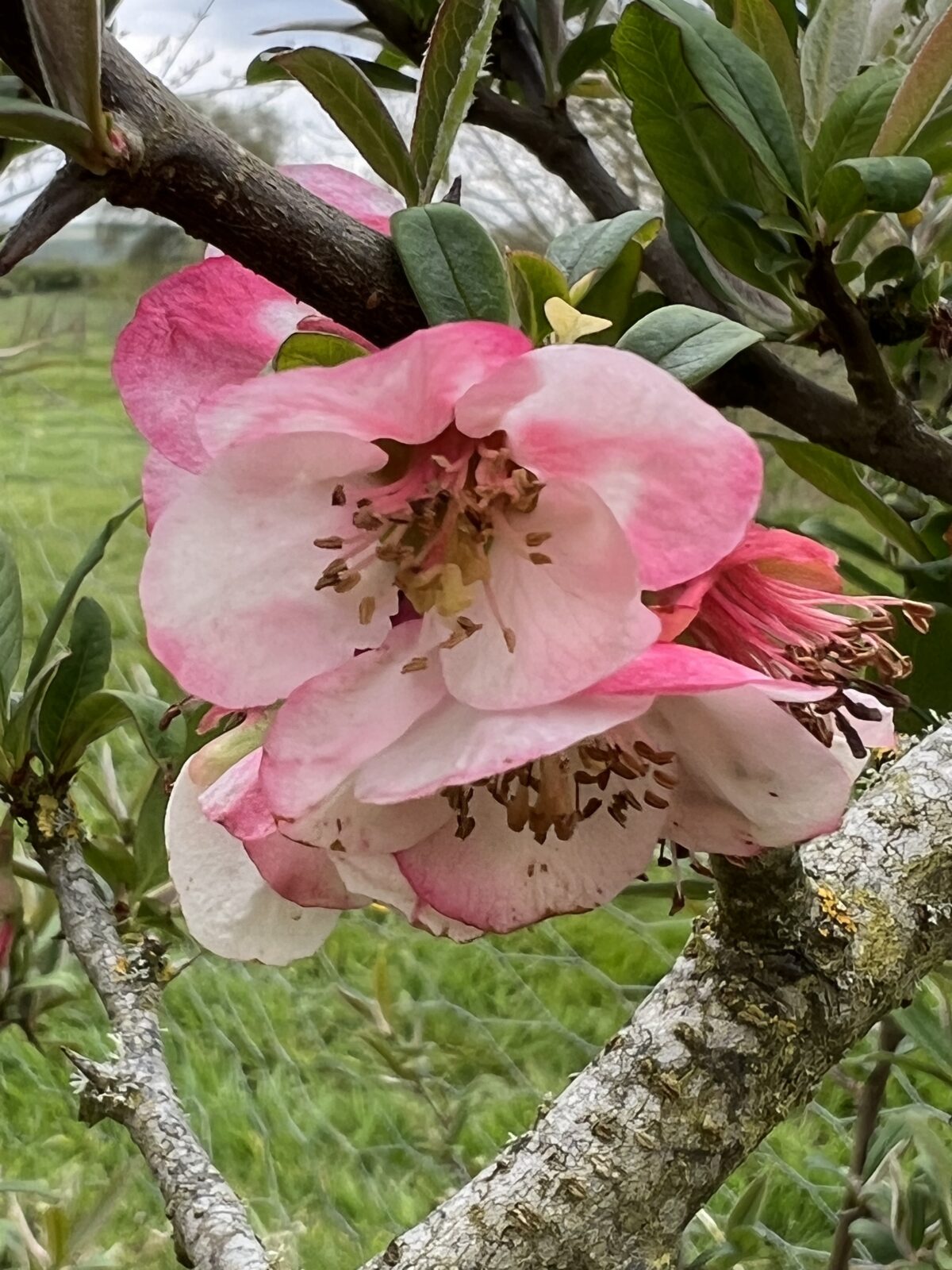 Grown both for its salmon-pink and white blossom in spring and for the very large, yellow, pear-shaped fragrant fruit, this large shrub from W. China will reach up to 3m x 3m if left unpruned. The fruit are the largest in the genus and make very good eating when cooked, often used in jellies and pies and very good combined with apples. A bowlful in the house is a scented delight. Tough and easy.