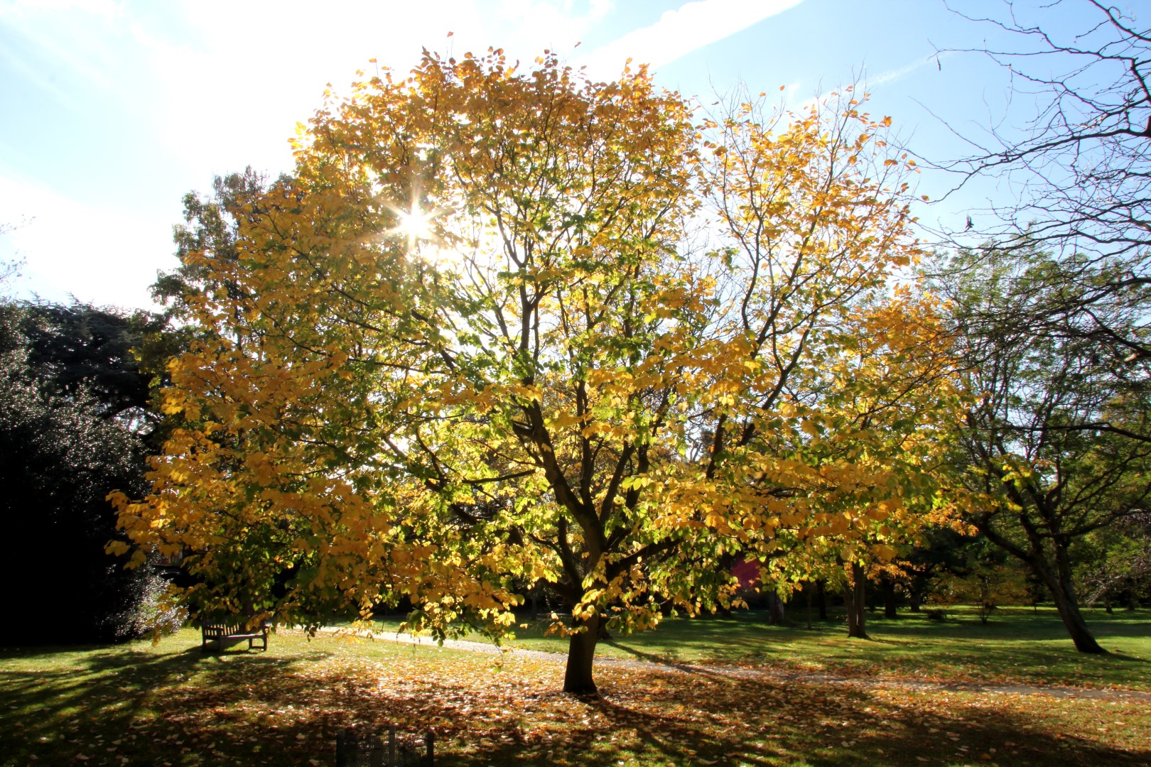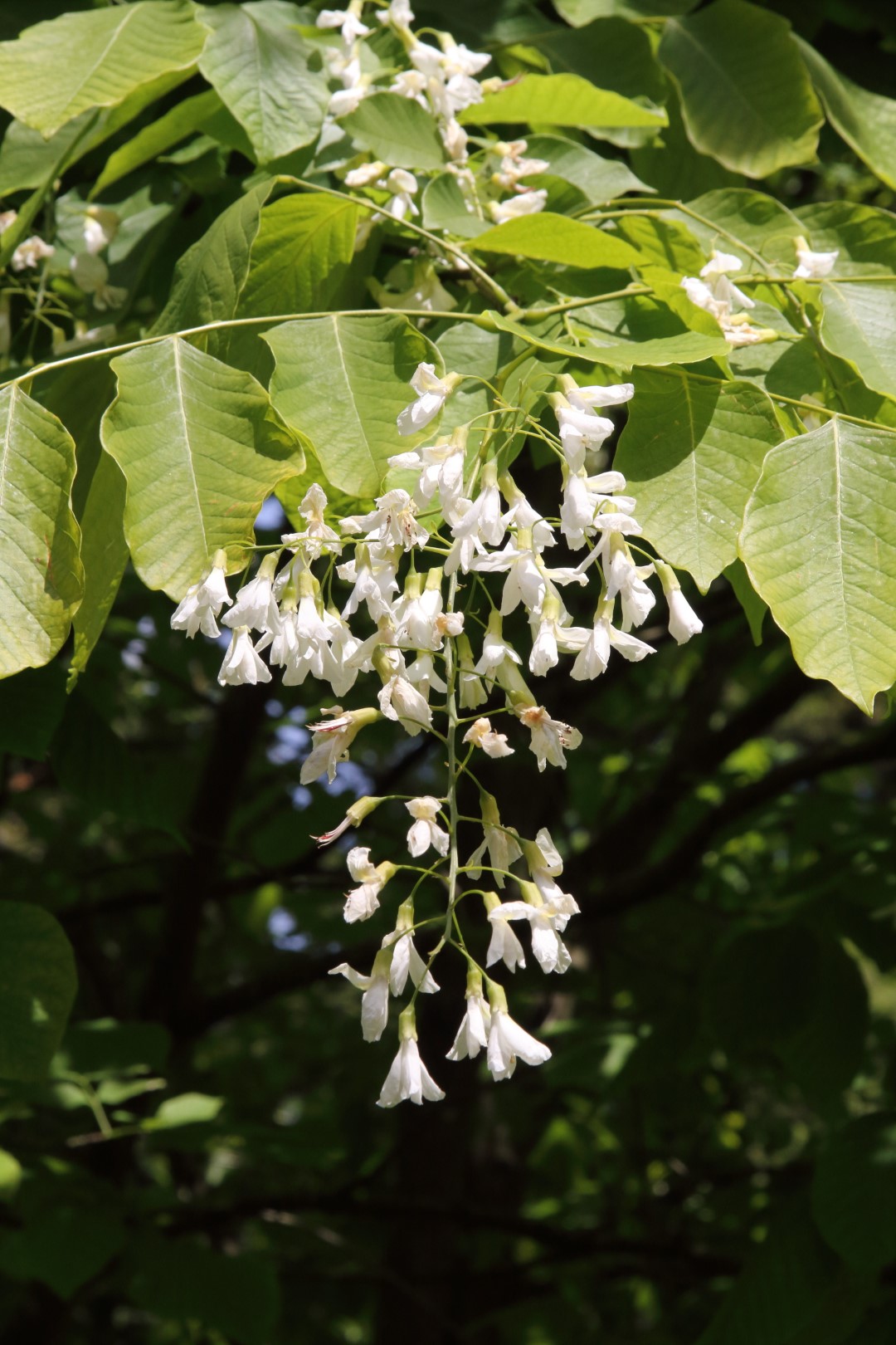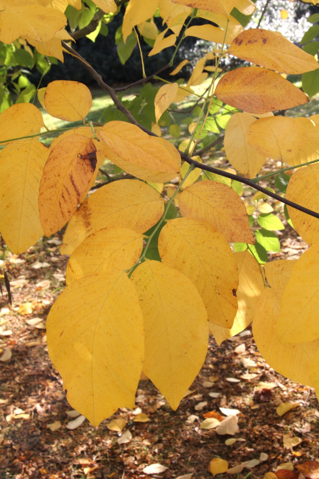 The Yellowwood from the SE USA is yet another neglected species in Britain and forms a very attractive medium sized tree here, with unusual alternately pinnate, bold foliage with large leaflets, turning to a really excellent clear yellow in autumn. The long drooping panicles of fragrant white pea flowers in June have a Wisteria-like quality and the bark is a smooth grey. Easy in most places, enjoying sun.