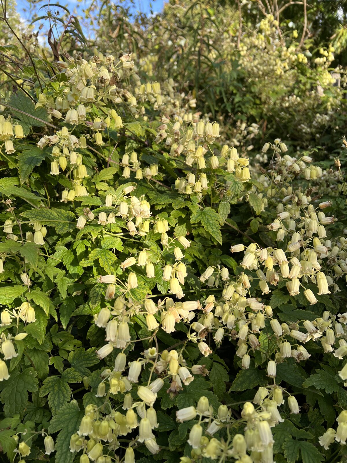 A favourite late flowering, hardy species from W China with clusters of Cowslip scented, soft primrose-yellow bells profusely borne during late summer and autumn on stems potentially to 7m given suitable support. I have seen this very successfully associated, on a brick wall, with early colouring Parthenocissus quinquefolia.