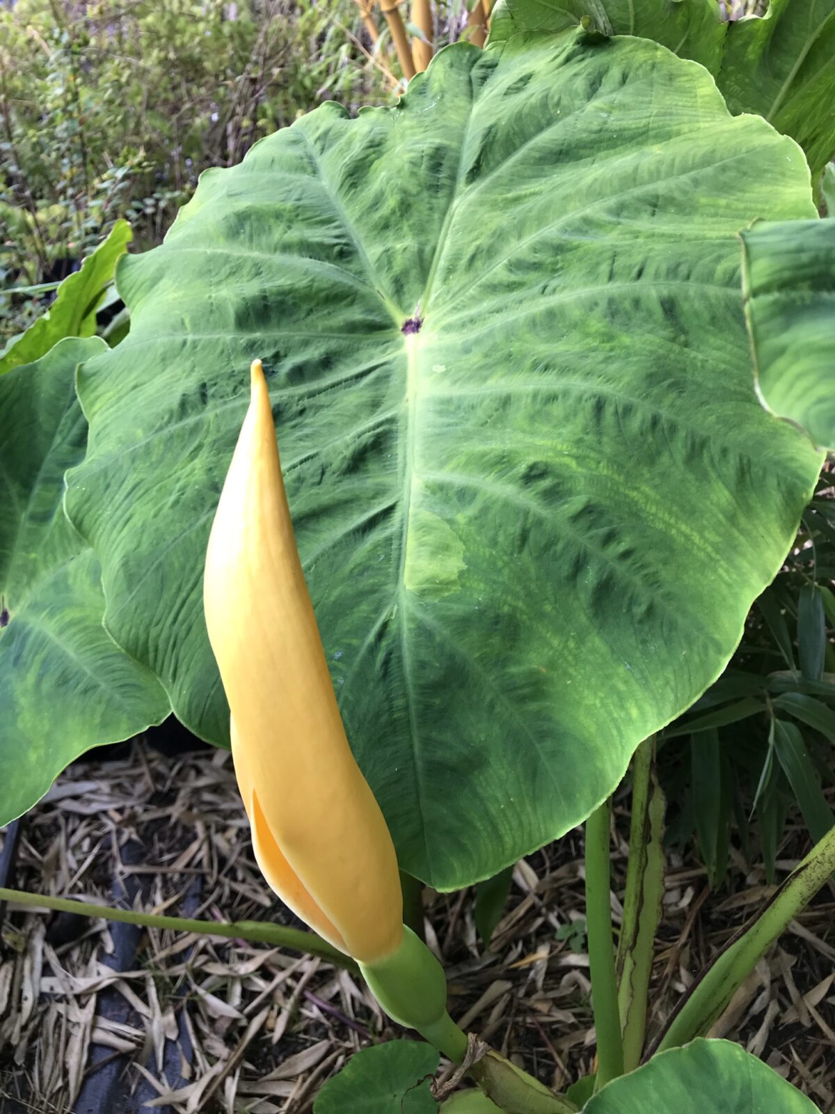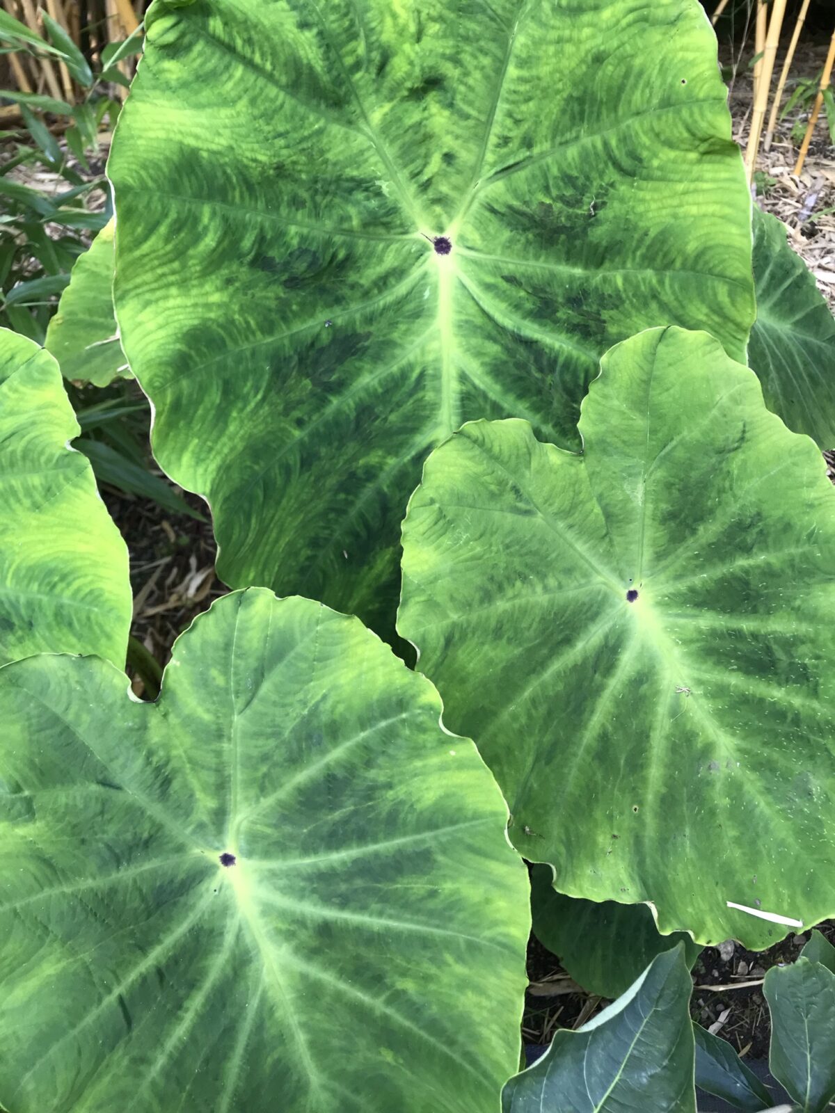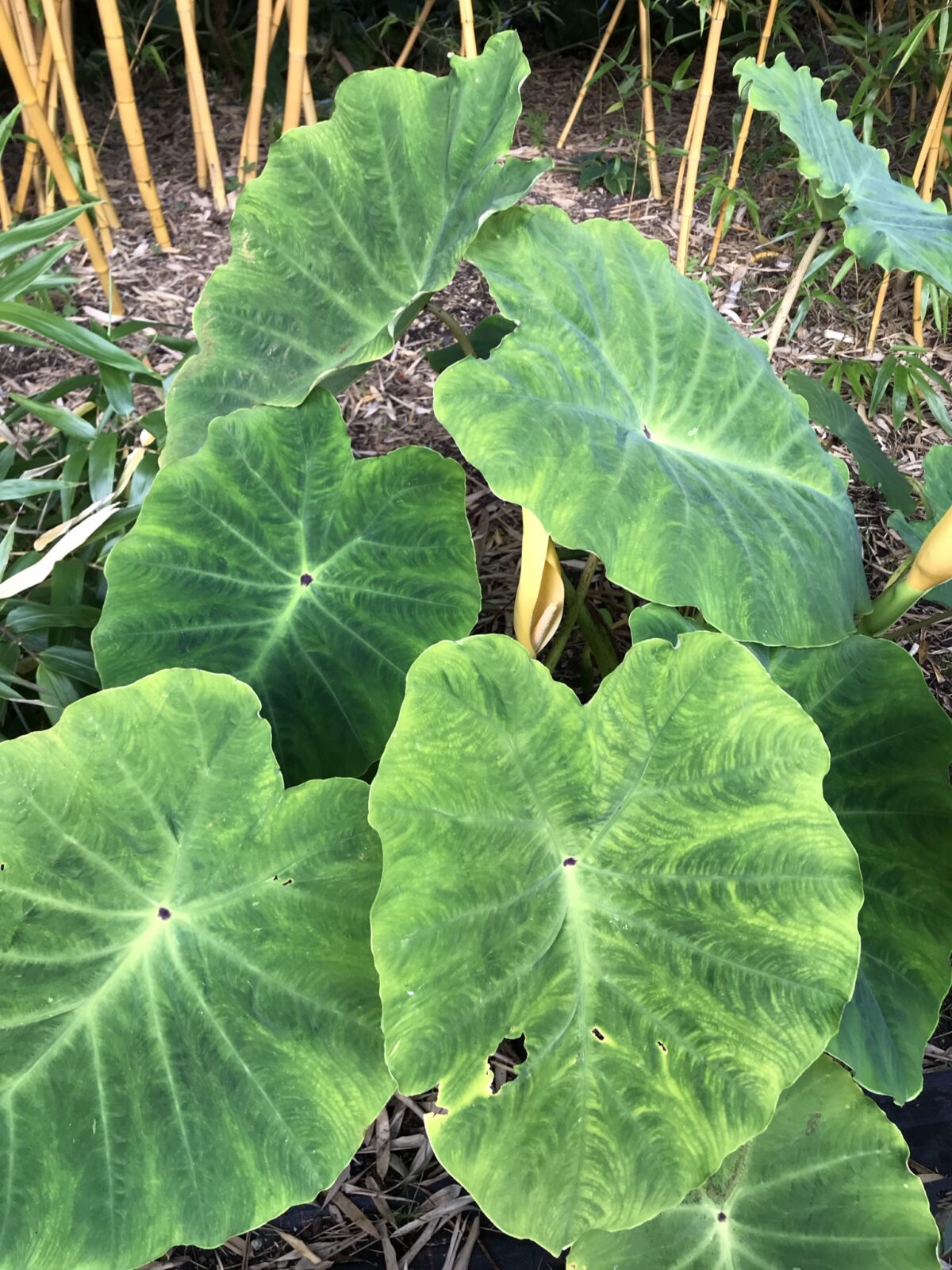A superb exotic foliage plant and the hardiest Taro, growable outside across the UK, even without a mulch in milder winters. Just mulch over in winter if you are very cold or just hyper-cautious. Big shield-shaped leaves with a matt surface and subtle black markings between the veins on emergence, turning green with just a purple-black 'belly button' in the centre. Fairly large warm-yellow aroid flowers in summer. Forms a good patch by stolons. Moist soil in sun or shade. Height to 75cm and leaves to at least 40cm long.