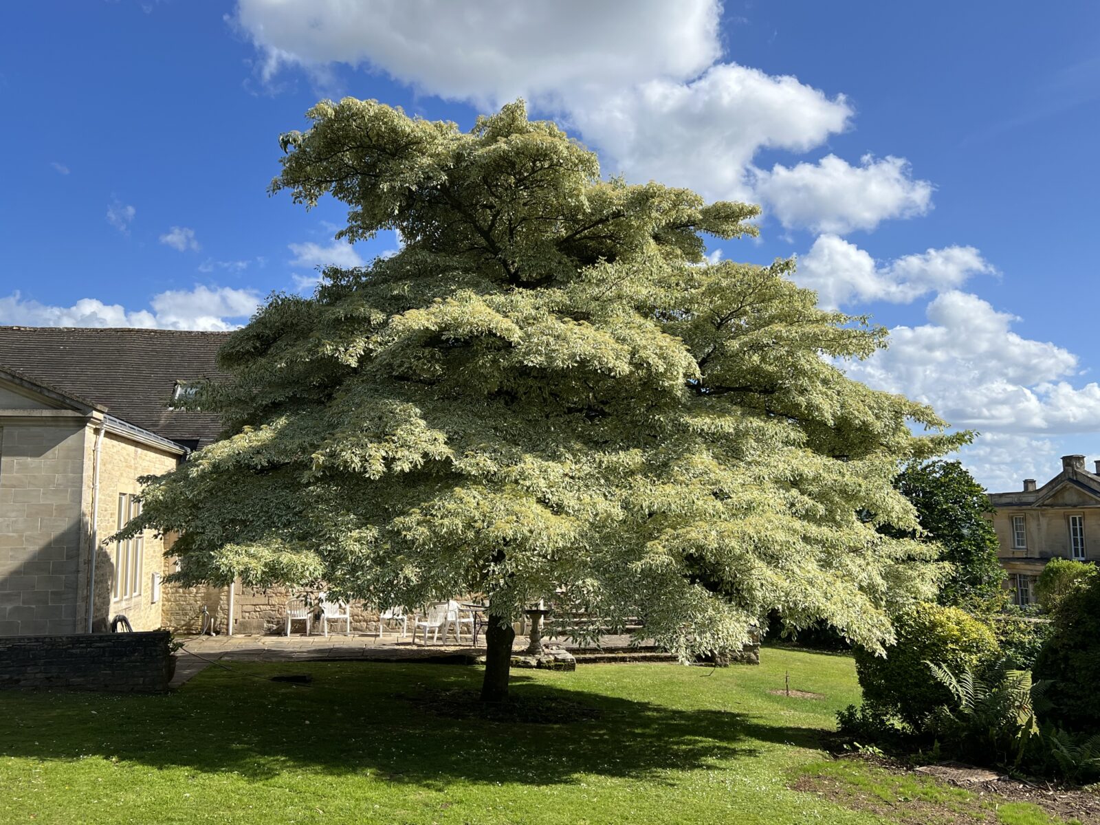 'Wedding Cake Tree'. A well known and ornamental small deciduous tree with level and distinctly layered branching, and strikingly variegated white and green foliage, providing a unique effect in gardens. Grows well on any ordinary soil. Young plants usually look a bit lopsided, but will sort themselves out if left alone.