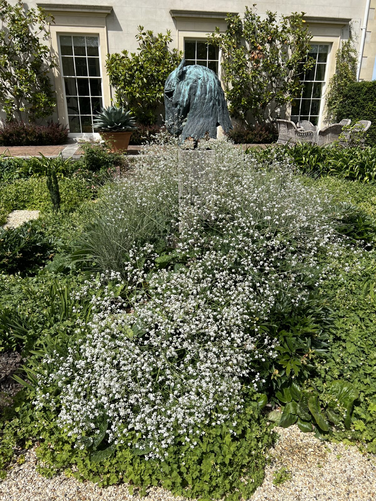 Massive, fabulous, open heads of diffuse white flowers to about 1.5m or more in early summer over big dark-green foliage, which then gets devoured by things that find it tasty. Easy.