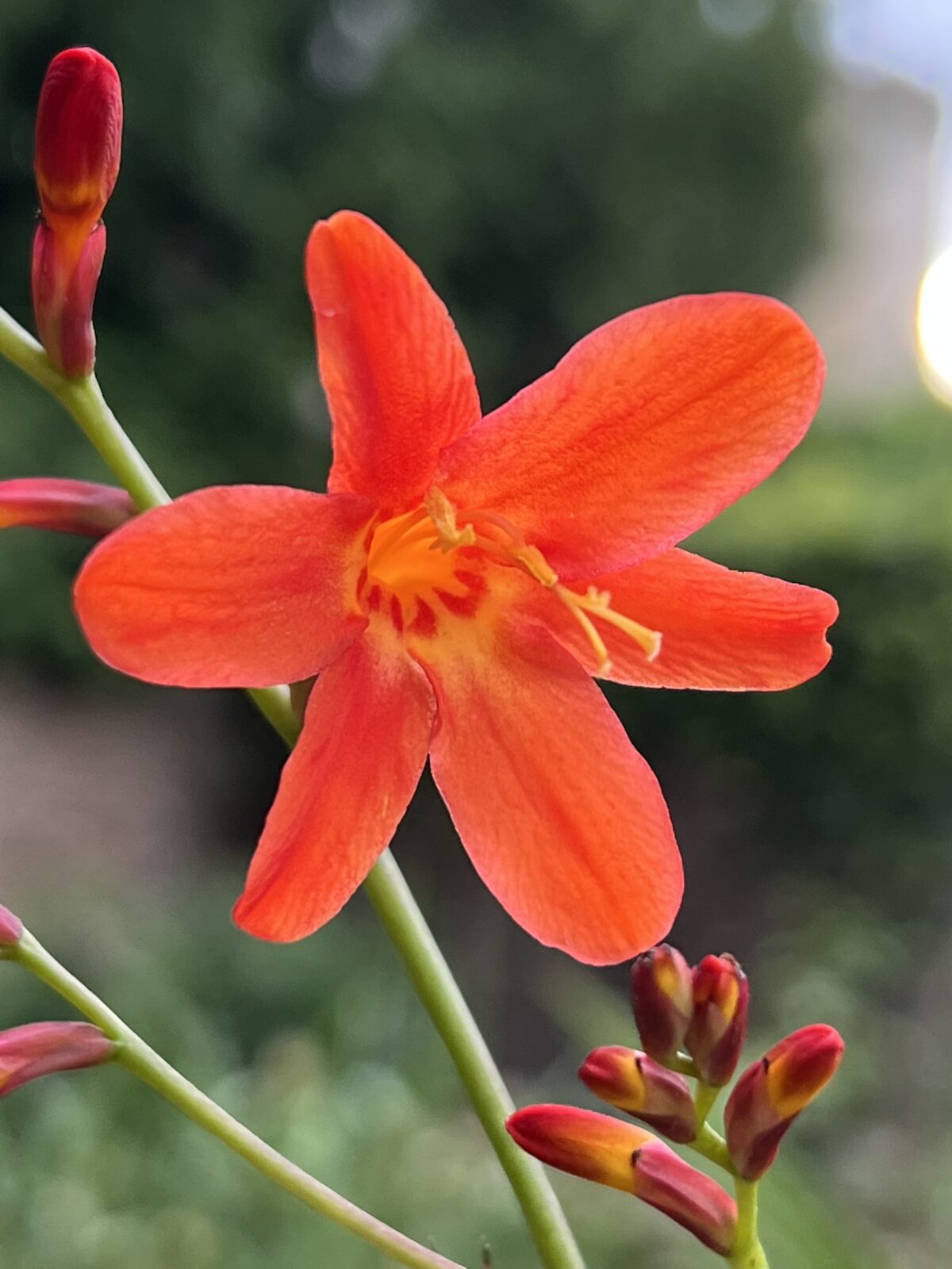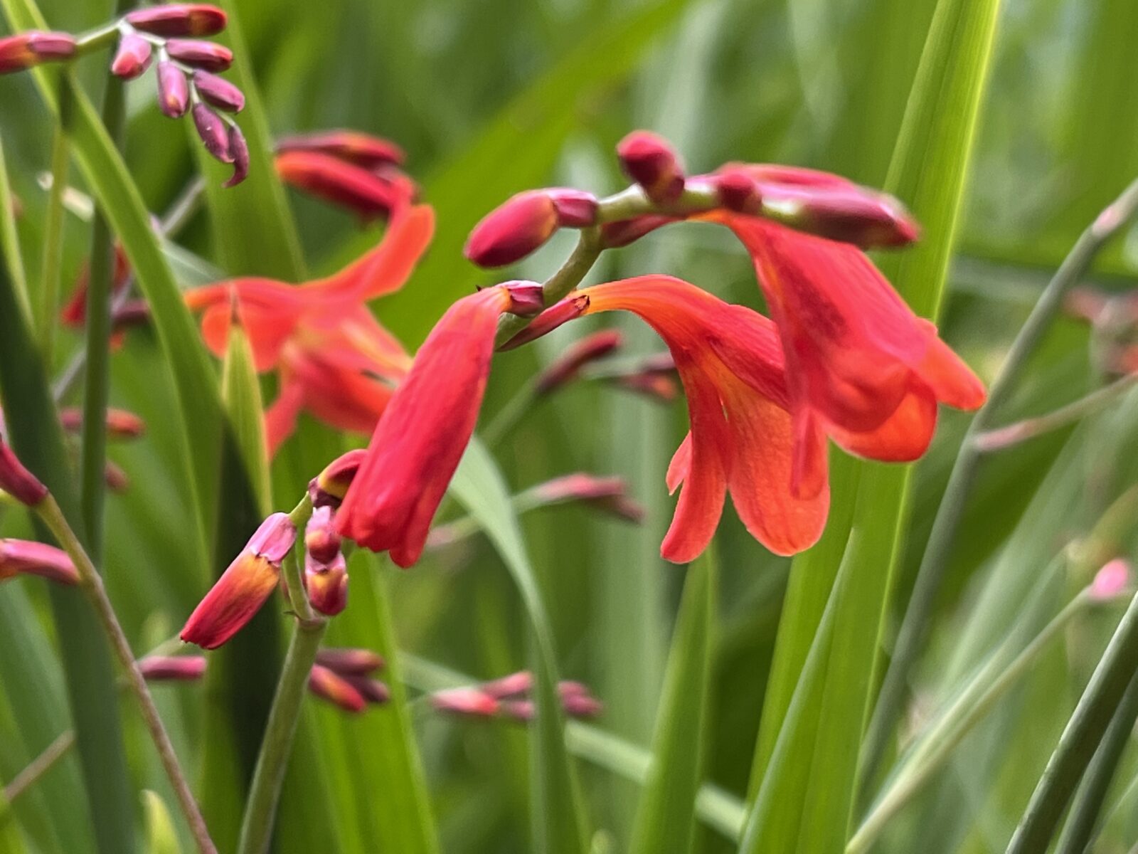 Brilliant orange-red flared flowers with yellow throats on dark-tinted stems above rich-green linear foliage in high summer. Sun and well drained soil.