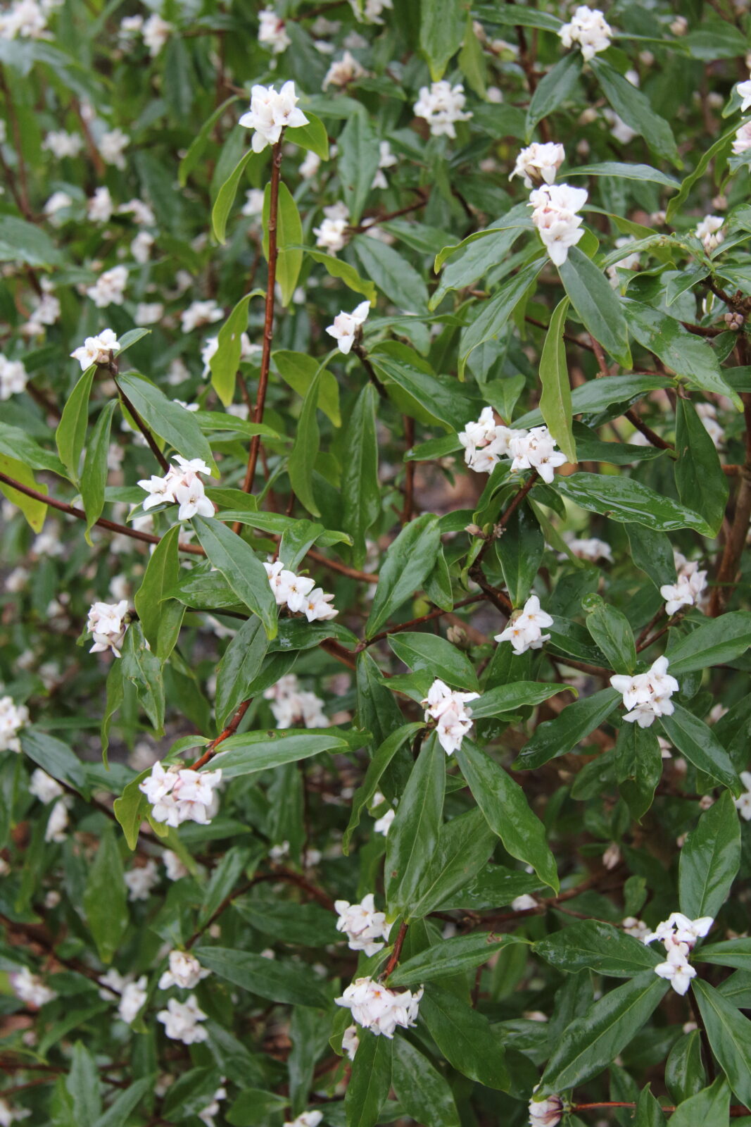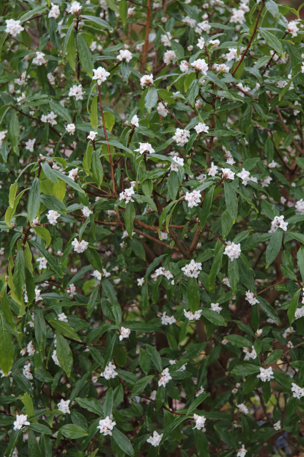 Similar to D. bholua, but with the spicy citrus fragrance of 'Fragrant Cloud', this is indeed a hybrid of D. acutiloba 'Fragrant Cloud' x D. bholua 'Jacqueline Postill'. Bushier than D. bholua but of similar height, ie 2.5 to 3m, and later in flower and with a longer flowering period in spring; up to 10 weeks. Flower buds are pink-flushed but the open flowers are cream.