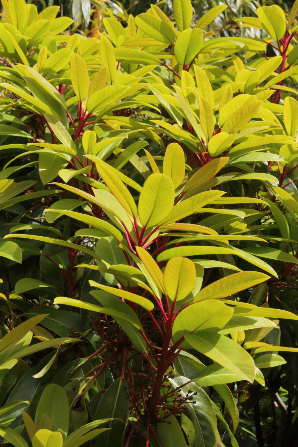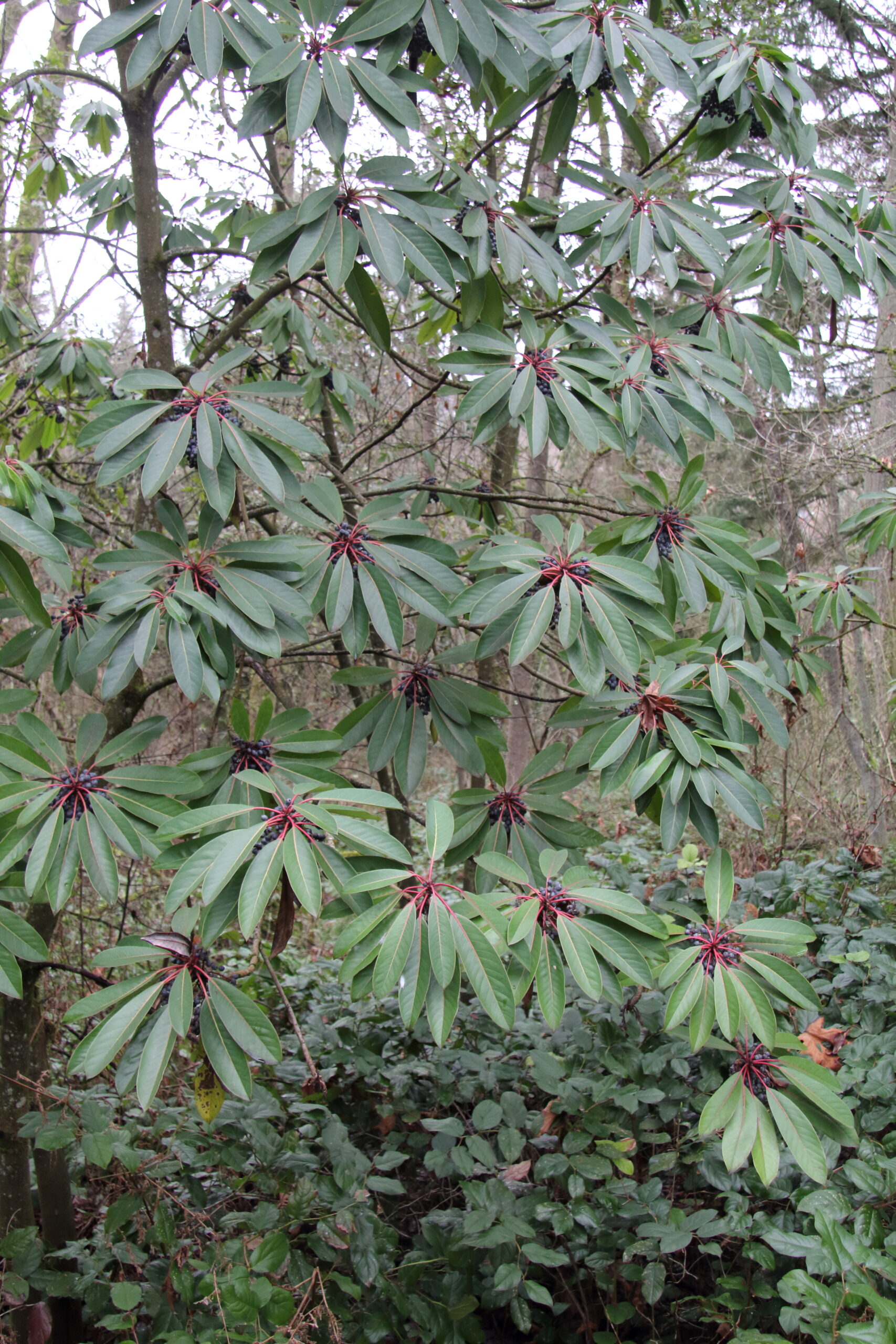 A superb, unusual, evergreen, large shrub with fairly sizable Rhododendron-like foliage, pale beneath and with red petioles. Easy and hardy in any good soil, acid or alkaline, in sun or shade. Male flowers, when in bud, look a bit like Mulberries and females bear attractive fruit. An aristocratic foliage plant of fine form, with leaves emerging in spring a rather gorgeous subtly bronzed golden-green. Can be nipped by late spring frost, but always reshoots. Sometimes named D. himalense var. macropodum.