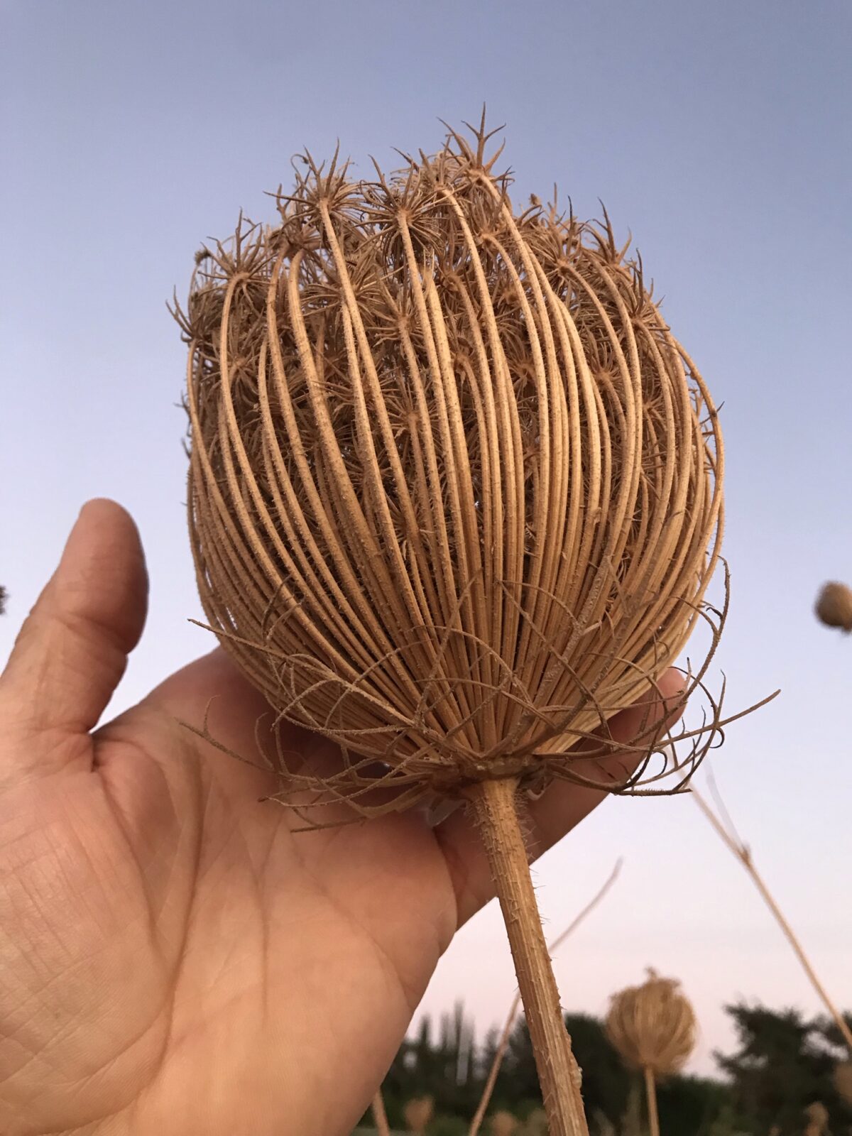 The wild Mediterranean Carrot is a giant subspecies to 1.5m tall, but this form originates from Cyprus where plants were up to 2.5m tall! Deeply dissected hairy, lacey foliage and vertical stems topped by white or pale pink delicate looking umbels, giving way to seed heads that curve and close in on the seeds, making an attractive and curious, almost globose structure. For most soils in sun.