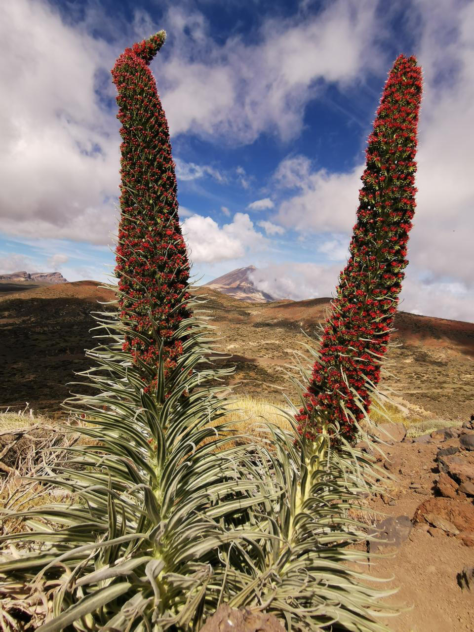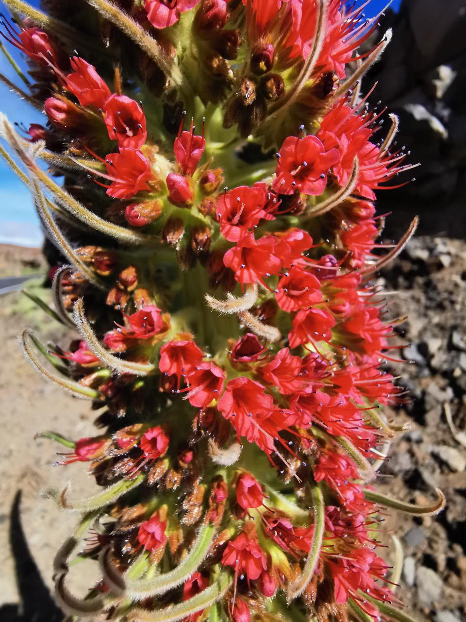 In flower this is one of the most incredible sites in the plant world. Big conical towers comprising thousands of small red flowers, 1 to 3m high over rosettes of silvery slim foliage, highly attractive to bees. Hailing from the upper slopes of Mt Teide on Tenerife, this is actually hardier than E. pininana. A success in mild coastal areas/London or potted and overwintered under glass. Bi or triennial. This can be overwintered succesfully in much colder places, even through very nasty winters, if afforded an airy closh
