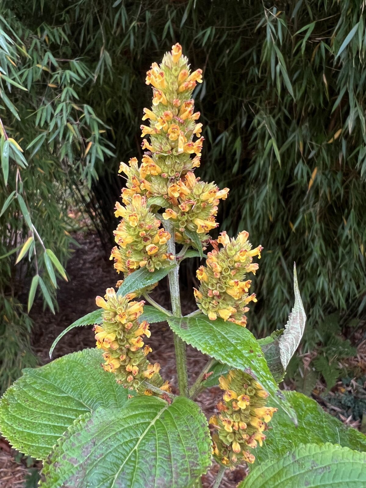 A collection from the Japfü massif, Nagaland, NE India, at 1830m asl. This species has broad sumptuous foliage that emerges deep purple and holds this colour for a while, especially at the extremities of the leaves. Terminal heads of small warm-yellow flowers in late autumn. Height to 1.8m. Mulch over the base in winter to be safe, but hardy here without for a few years so far.