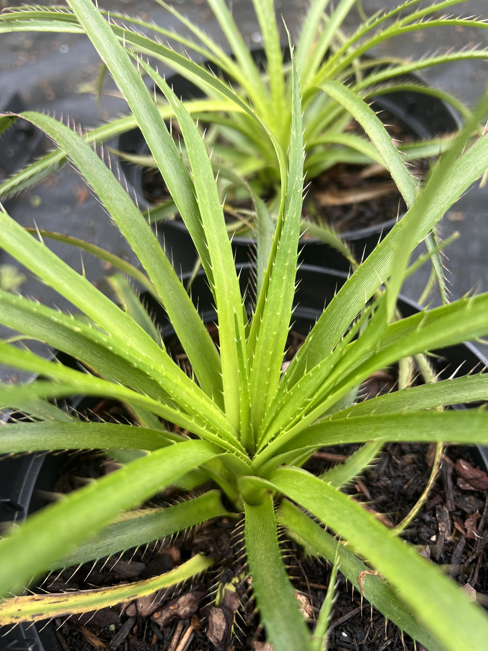 An unidentified South American species forming low evergreen rosettes of particularly slim, linear, spine-edge foliage, sending vertical flowering stems to only 80-90cm with rounded thimbles of white flower in summer, attracting a multitude of pollinators. Similar in many ways to E. eburneum, but smaller in all its parts. For sun and reasonably drained soils.