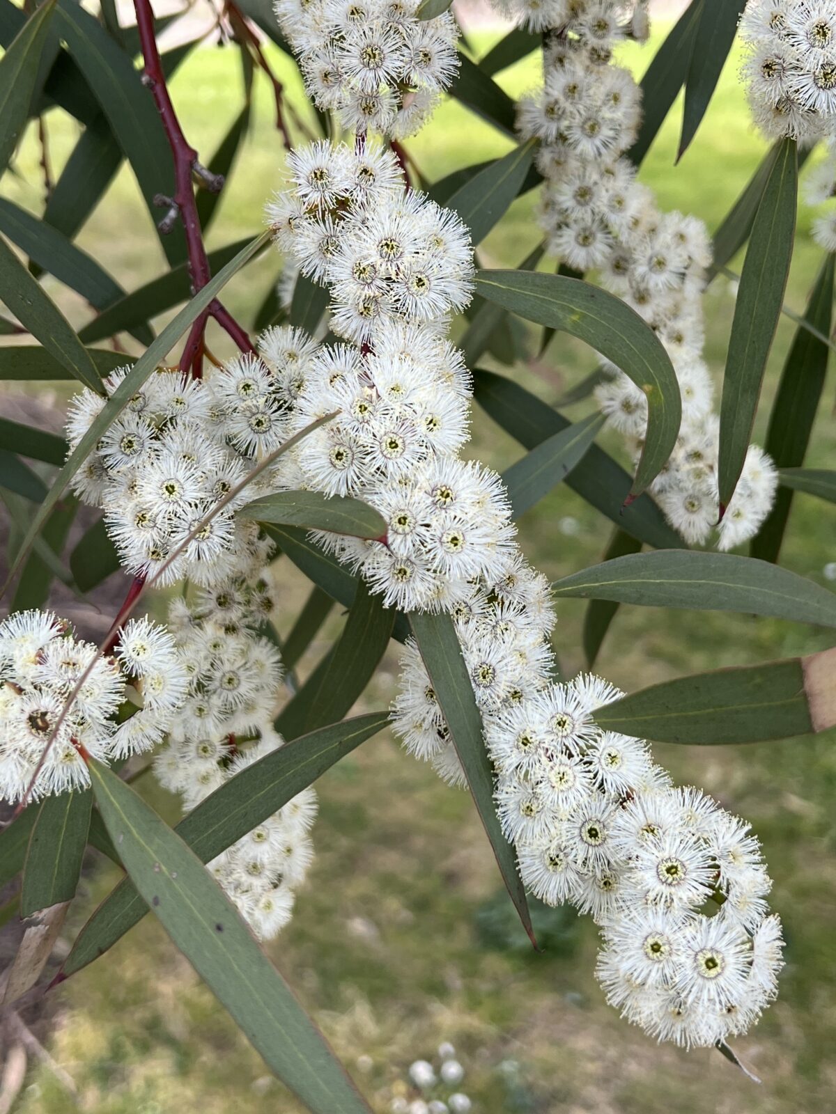 The Wolgan Snow Gum is one of the most attractive of hardy gums. A hardy large shrub or small tree, with red young shoots contrasting beautifully with the masses of white flowers, grey-green narrow leaves and branches with grey and white or almost pure-white flaking bark. A relative of E. pauciflora, this deserves wider planting. Sun, drought tolerant. Lime tolerant and reached full size here on very alkaline loam, but happier neutral to acid.