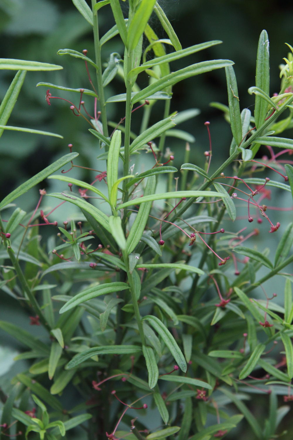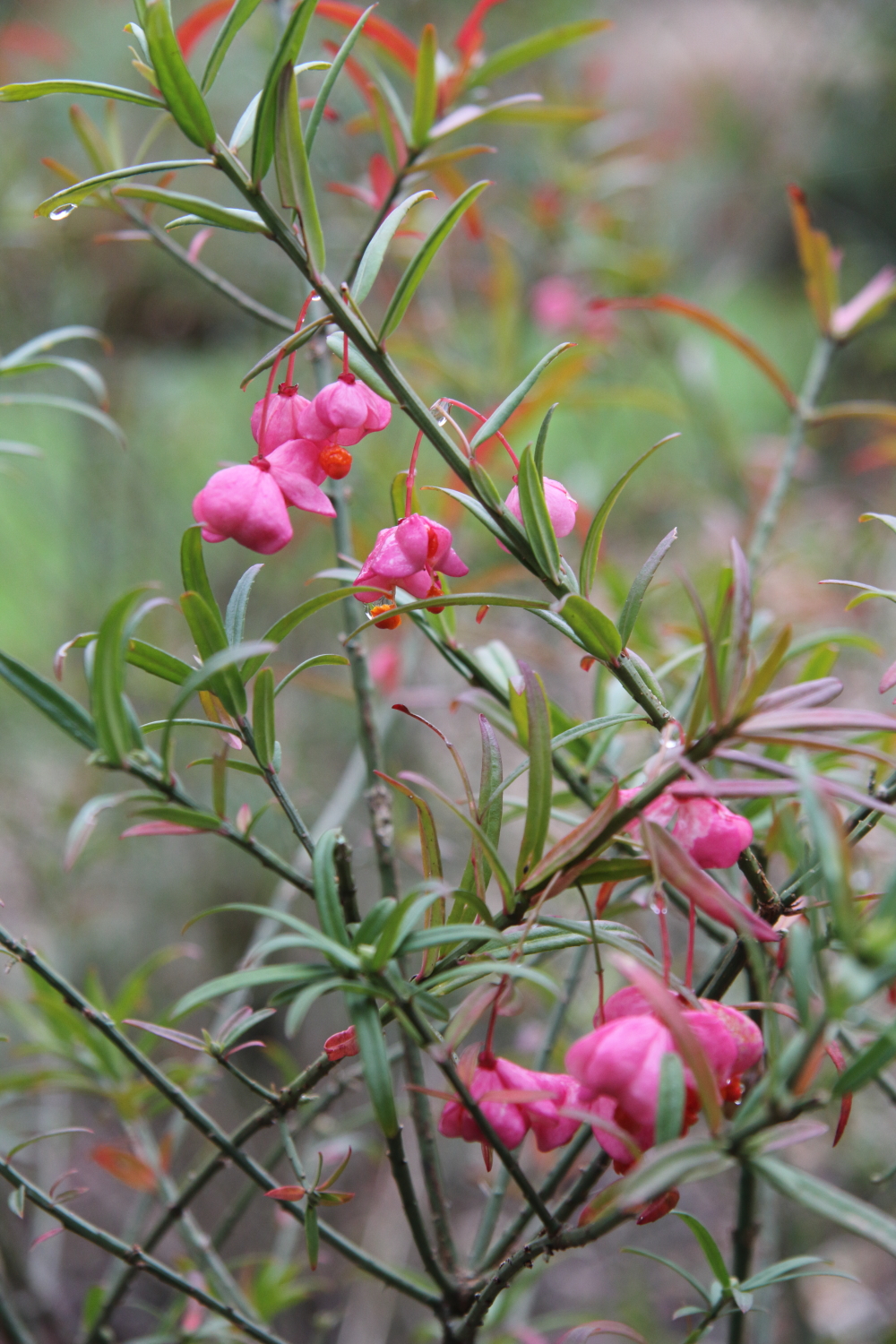 A dwarf semi-evergreen shrub from C. Asia to approx' 90cm high, with distinctive small, narrow, almost rosemary-esque foliage; very different from any other cultivated spindle. The inconspicuous tiny red flowers in summer are followed by decent sized flesh-pink capsules, opening to orange seeds. For sun or semi-shade. Very hardy.