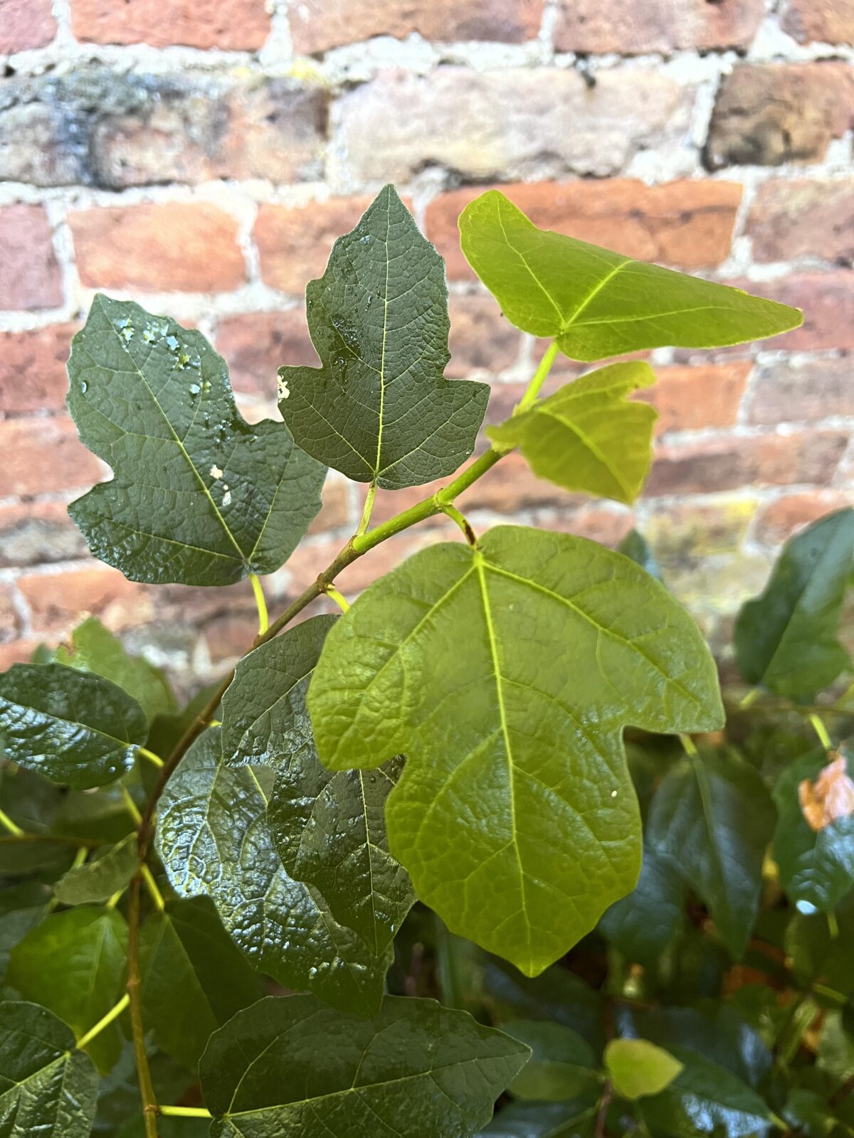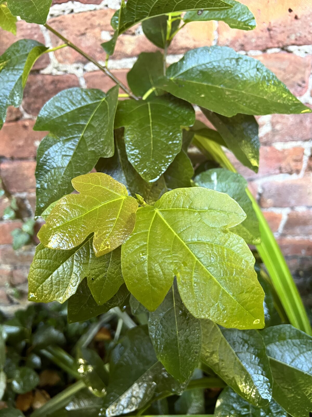 An exceptionally curious and unlikely sounding hybrid between the classic edible fig from W Asia and an evergreen climbing fig from the Far East, forming a scandent climbing plant closer to F. pumila, but with lobed foliage and a semi-deciduous habit. Generally hardy over most of the UK, this is best against a sunny wall, where it will forever be a talking point.