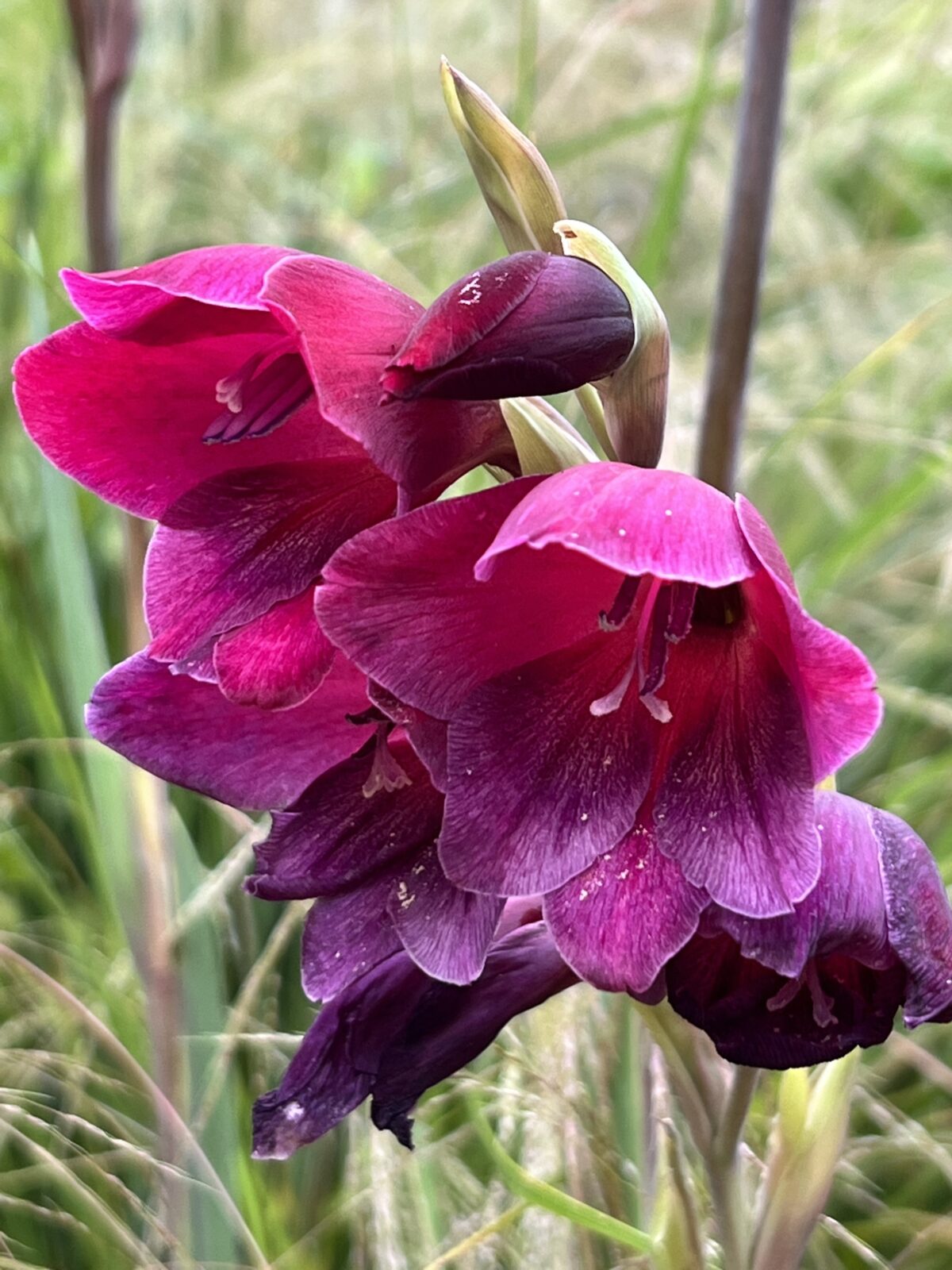 A hybrid of the very hardy G. papilio. The hooded, nodding flowers are very dark red with darker interior markings and the foliage is glaucous. Flowering late summer at about 1m. Quite different from the usual top heavy gaudy things. Not too dry in the growing season please. A darker flowered seedling, very similar to 'Ruby'