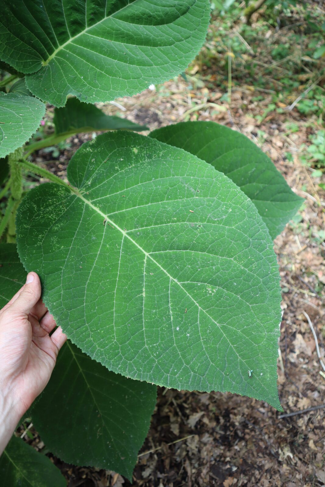 A distinct form of sargentiana from the French arboretum 'La Fosse', in the Loire Valley. The huge leaves are more rounded in form, with an even tougher texture. The overall shape of the plant is more bushy, reaching 2m high. The big blue and white lacecaps are seen, as usual, in July/August. For a bright but fairly wind sheltered site. Hardy.