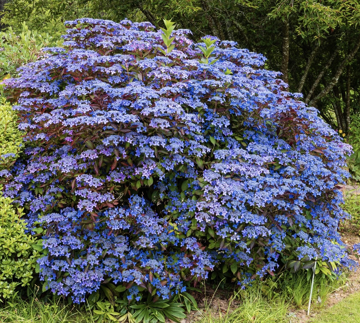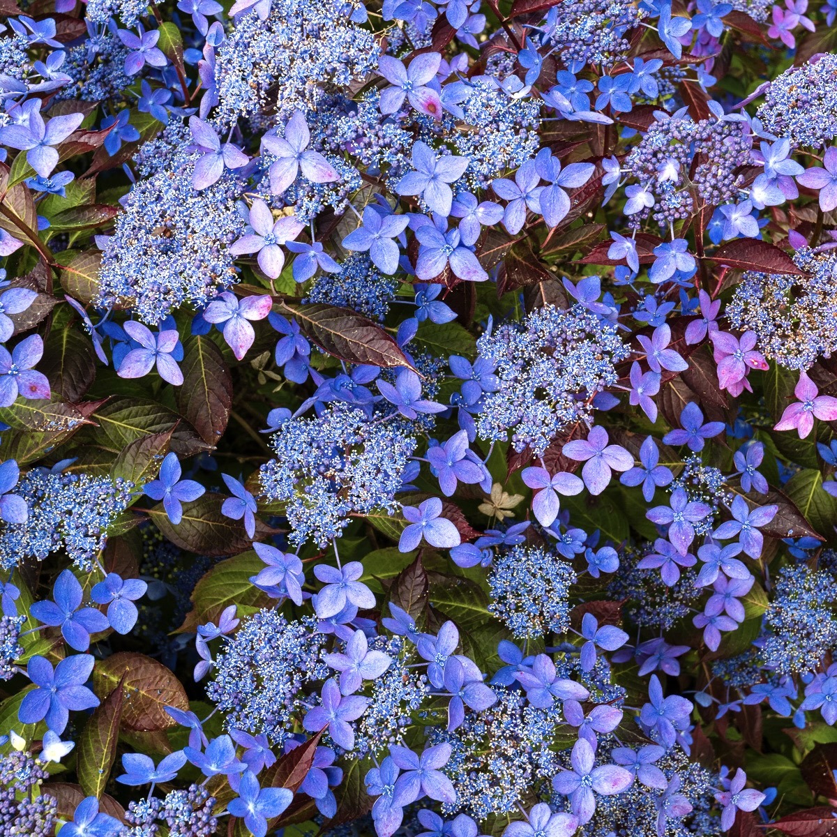 A sister to 'Garden House Glory' this was raised at the same time. A small shrub to just over a metre, this is best grown on acid soils. Not because it won't be perfectly happy on alkaline soils, but because of the intensity of the vivid blue lacecap flowers in summer, set against foliage that develops purple tints at flowering time. Flowers are pink on alkaline soils. Sun or semi-shade, with reasonably even moisture.