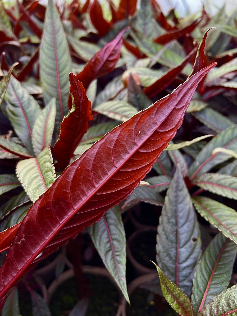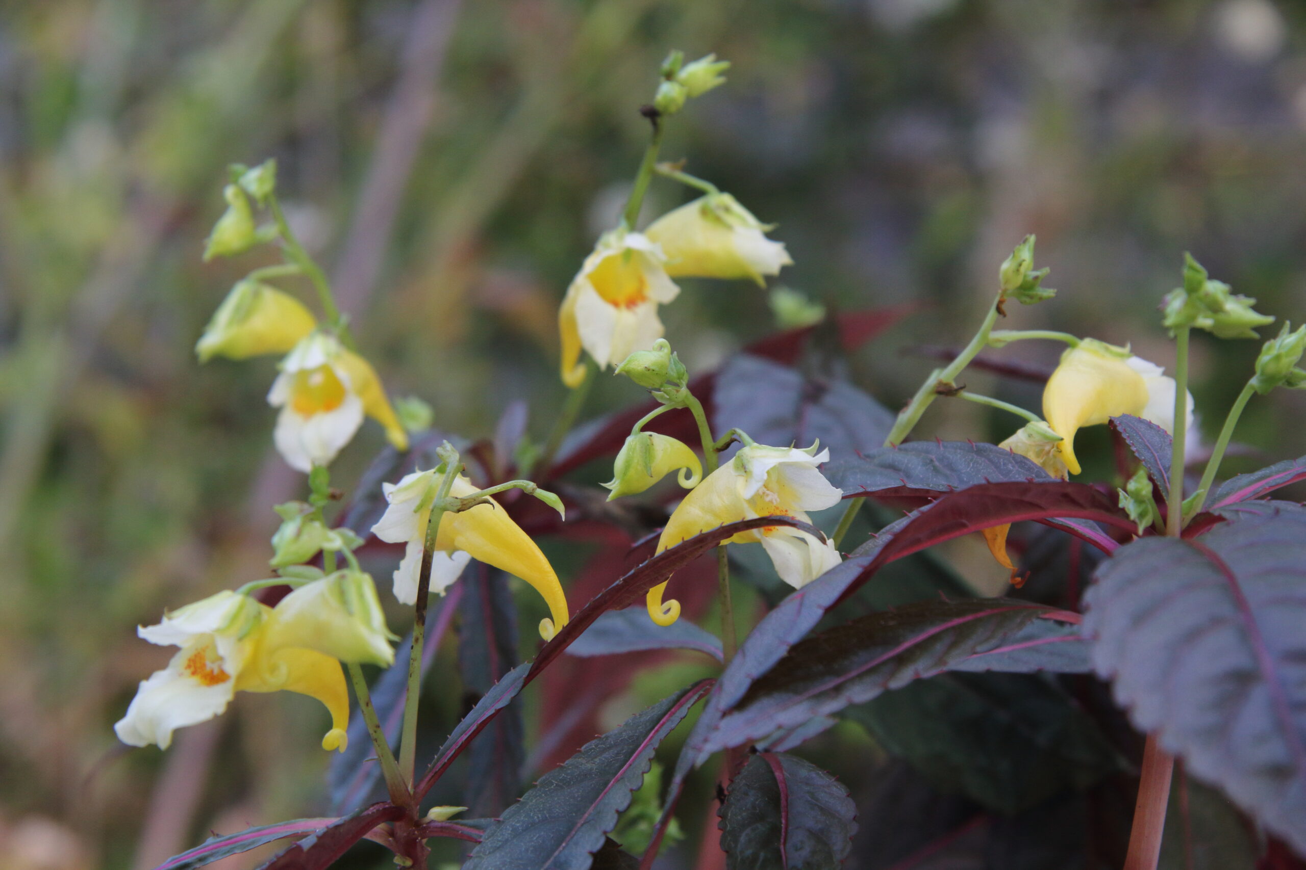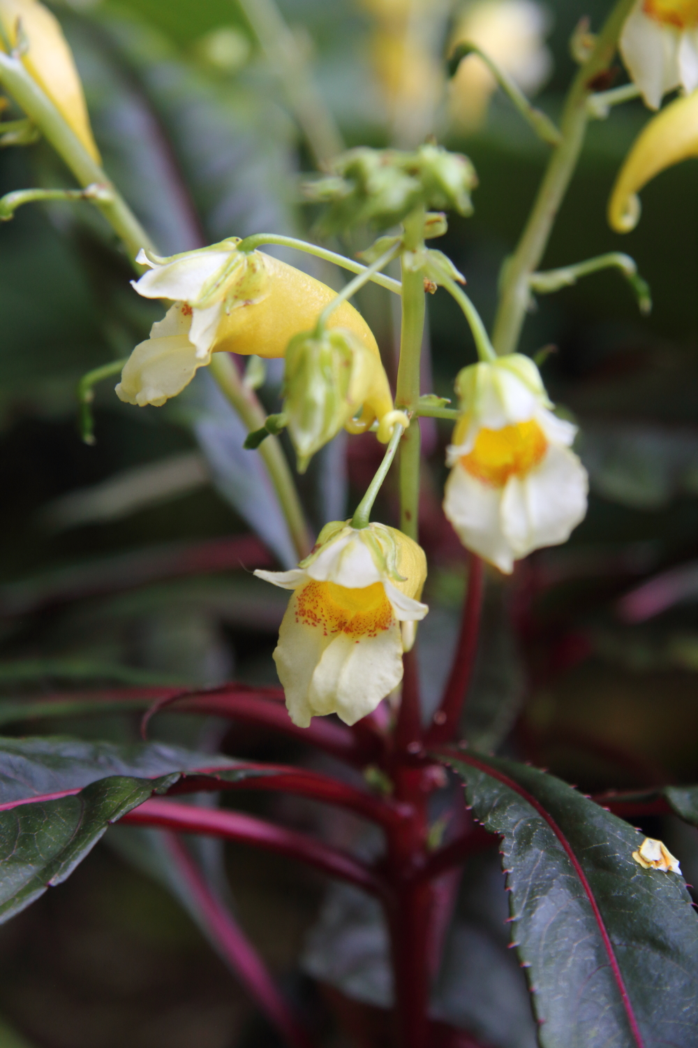 An exceptional new introduction of a perfectly hardy Impatiens, originating from Chinese seed, showing, in this clone, intense red pigment throughout the plant, but especially on leaf undersides and stems. This completely cold hardy species is best suited to some shade and not overly dry, humus rich soil. The large flowers, see June to October are cream and soft yellow with darker orange-brown markings in the throat. Height 45cm.