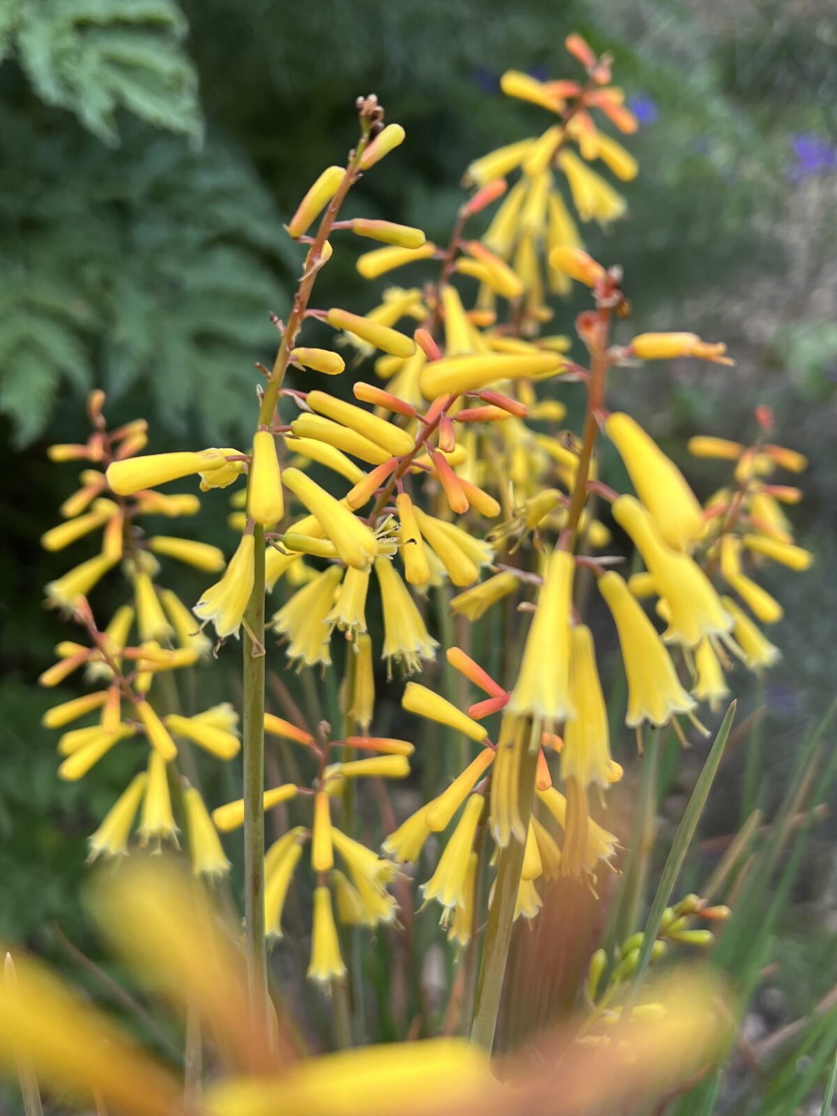 A dwarf South African species, now thought to be extinct in the wild. Short pokers of rich yellow from burnt-orange buds en masse in late spring/early summer and then sporadic flowers throughout the summer if happy, i.e. not bone dry and half starved. Height 45cm.