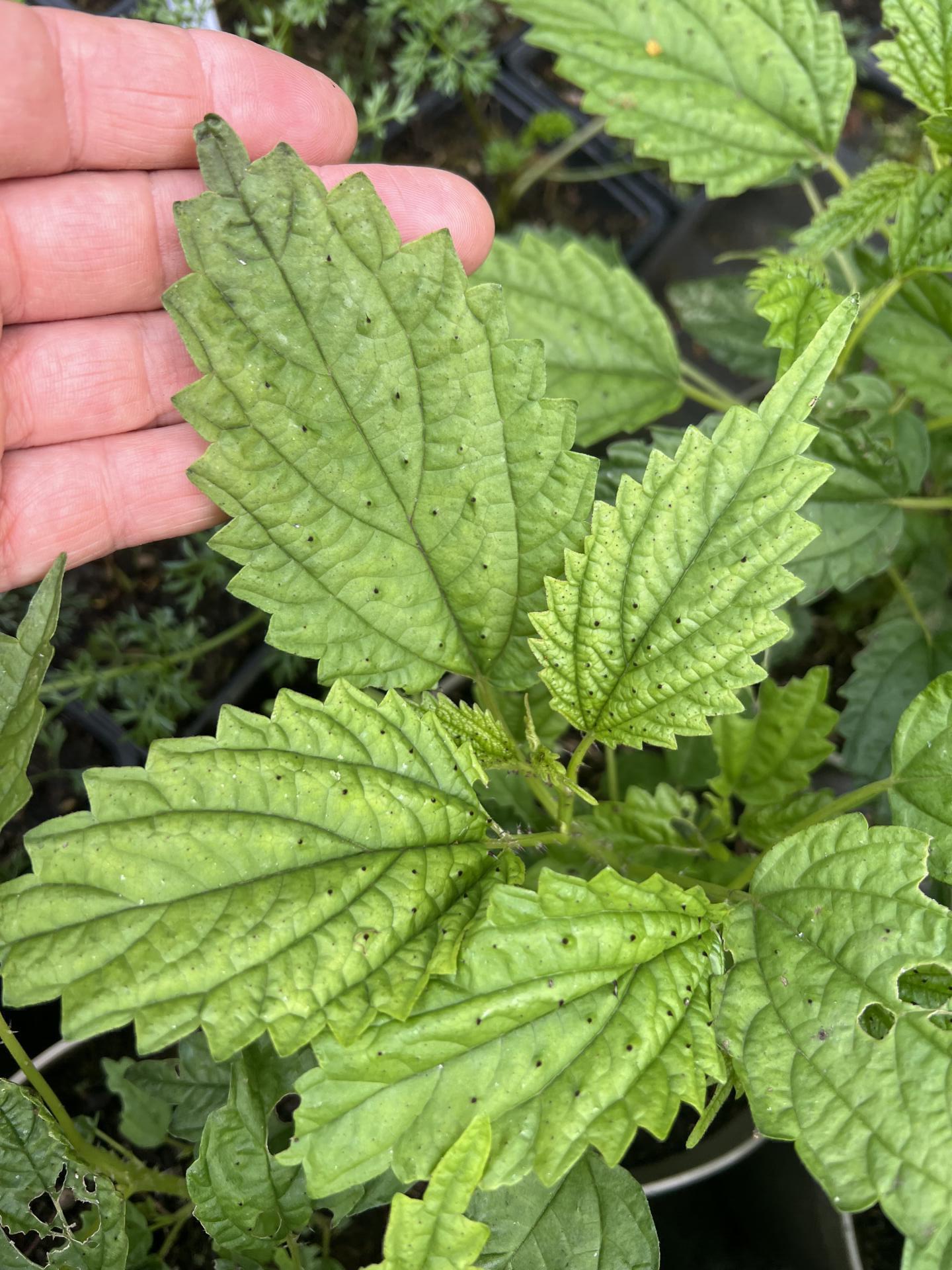 A member of the Urticaceae, ie the nettle family, from Myanmar, China, Korea and Japan, where we saw it growing in mountain forests. Possessing a sting like a tiny electric shock (and lasting no longer), rather than a nasty lasting burn, this makes a perennial to about 1m tall, with attractive well toothed and deeply veined foliage, covered on the upper side with tiny black conical non-stinging spines. White flowers top the stems in late summer. Almost definitely edible and highly nutritious, but that needs confirming.