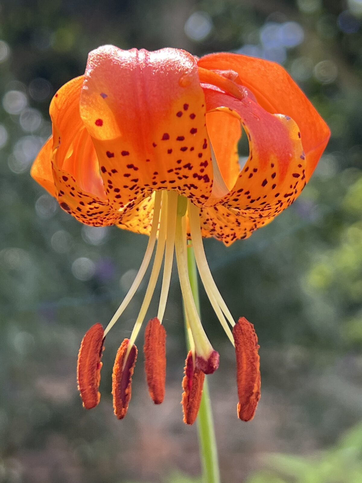 A rare form of this hardy Californian and Oregonian species collected in the Siskiyou Mts. Very similar to the commonly grown form, with splendid turkscap flowers composed of reflexed deep-orange petals, yellow at the base and with heavy dark red-brown spotting. The long protruding downward pointing anthers are rust coloured. Whorls of narrow foliage up the slim stems. For sun or semi-shade and most humus-rich well drained soils, though chalk is unsuitable.