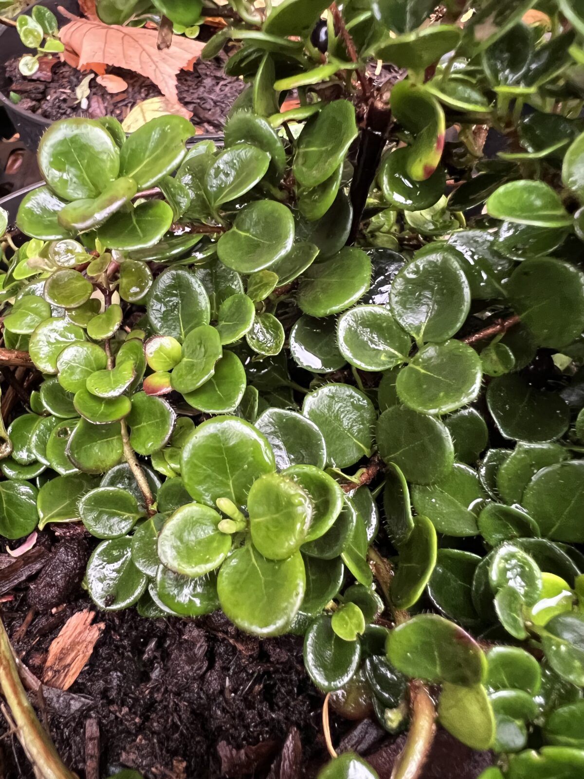 Really more a splendid ground cover than a climber, as it only gets to about 1m high, and as the former it makes a dense mat of very rounded small, evergreen, densely set semi-succulent foliage that takes on bronze tints in winter cold. The spring/early summer flowers are pale creamy-yellow and pink, followed by bluish-black berries autumn/winter. Hardy.