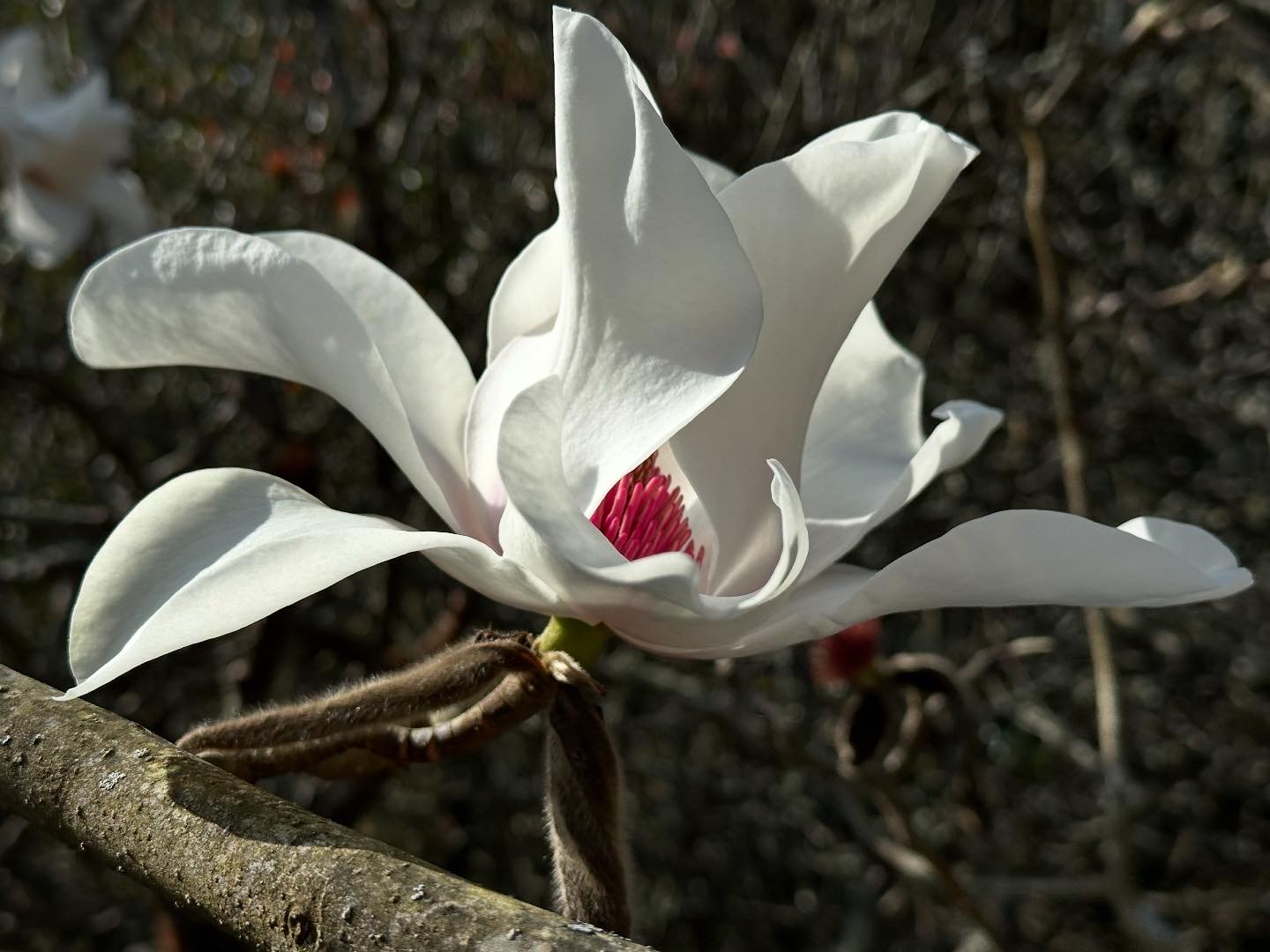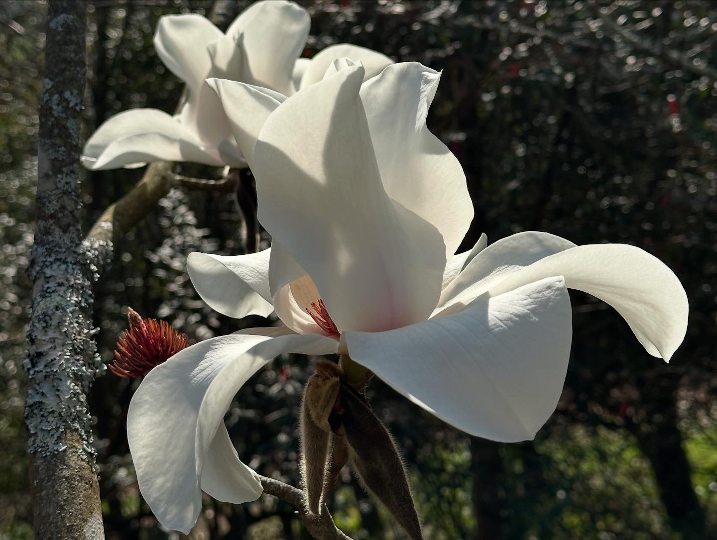 One of the most beautiful of all white flowered magnolias, due to the very elegant poise of the 23cm, pure white, cup and saucer flowers, with the outer tepals arching outward, but with their edges folded slightly inwards. Believed to be M. 'Pegasus' x M. campbellii var. alba, this has the growth form of the latter, though will not get as large; perhaps 6 - 9m max. Flowering in spring on the bare branches, this is fully hardy and best suited to good soils.