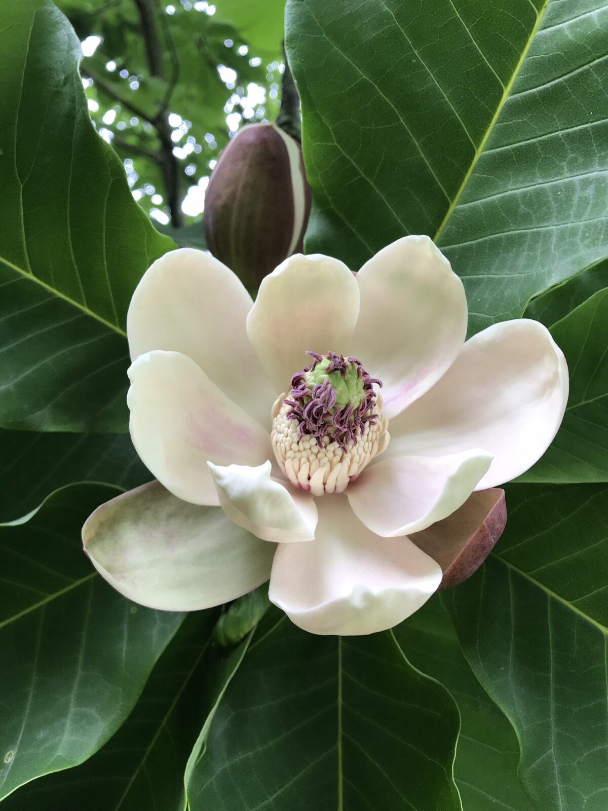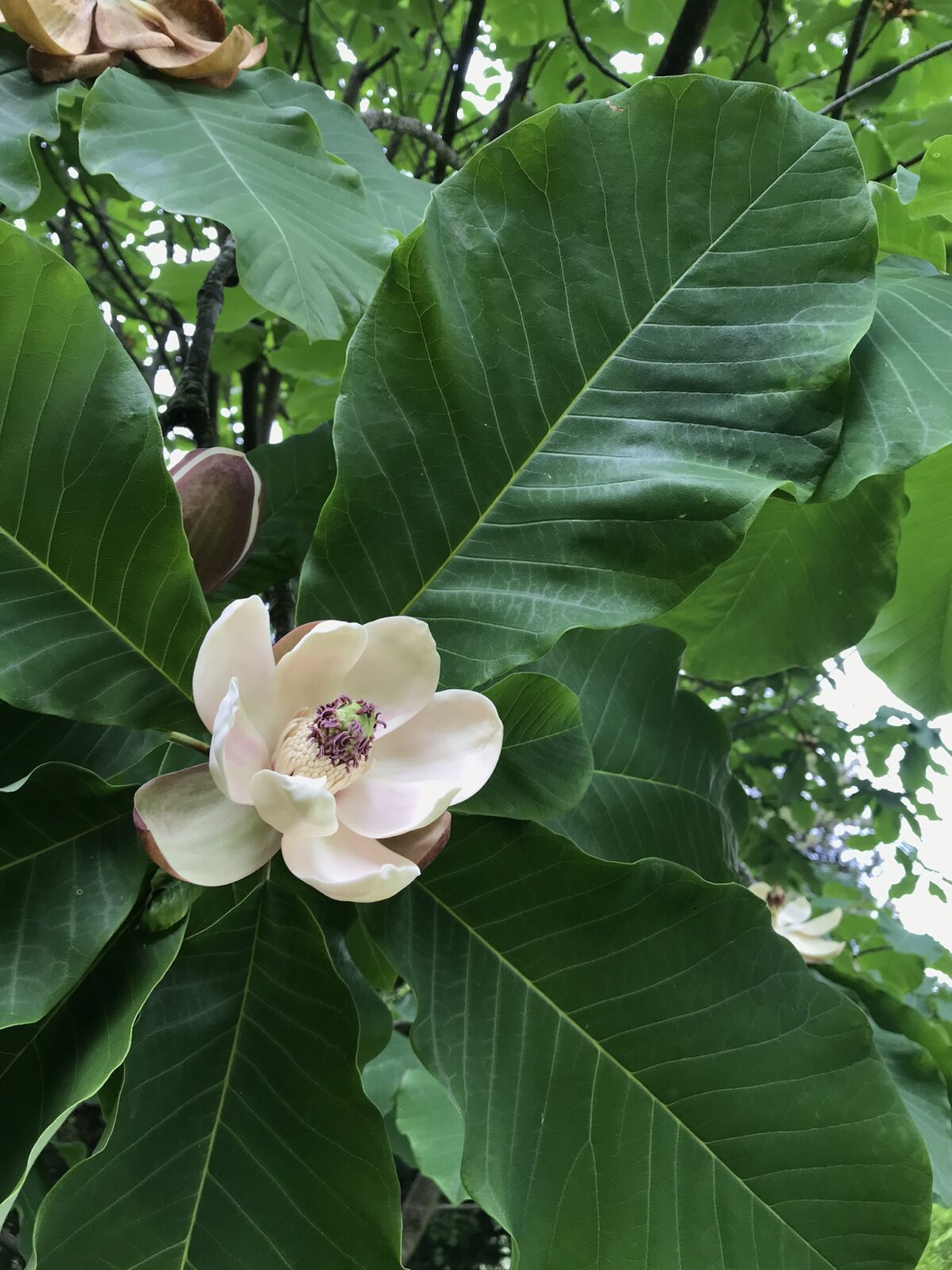 A vigorous and most desirable medium sized tree for good soil. Exceptionally strongly fragrant creamy flowers with crimson stamens borne in May/June over huge obovate leaves, followed by big red fruit clusters. A wonderful tree that should be in every tree collection and/or reasonably sized garden. The scent drifts on the breeze for quite some distance. Best with a certain amount of shelter from SW winds in exposed gardens due to the large foliage.