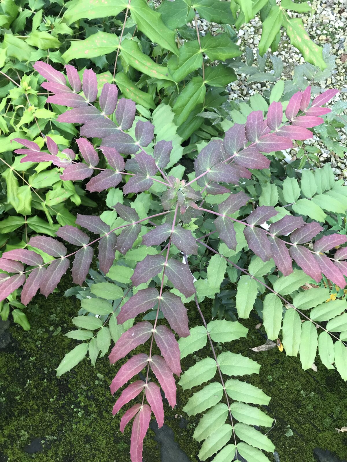 A new Mahonia, found as a chance seedling and named by Maurice Foster in Kent. This is most probably a hybrid of the variable M. duclouxiana and the splendid bold foliage is composed of well spaced fairly narrow leaflets in an unusual grey-green tone on red-pink tinged petioles. Long racemes of fragrant yellow flowers are produced on grey-pink tinged stalks in winter. A magnificent large shrub.
