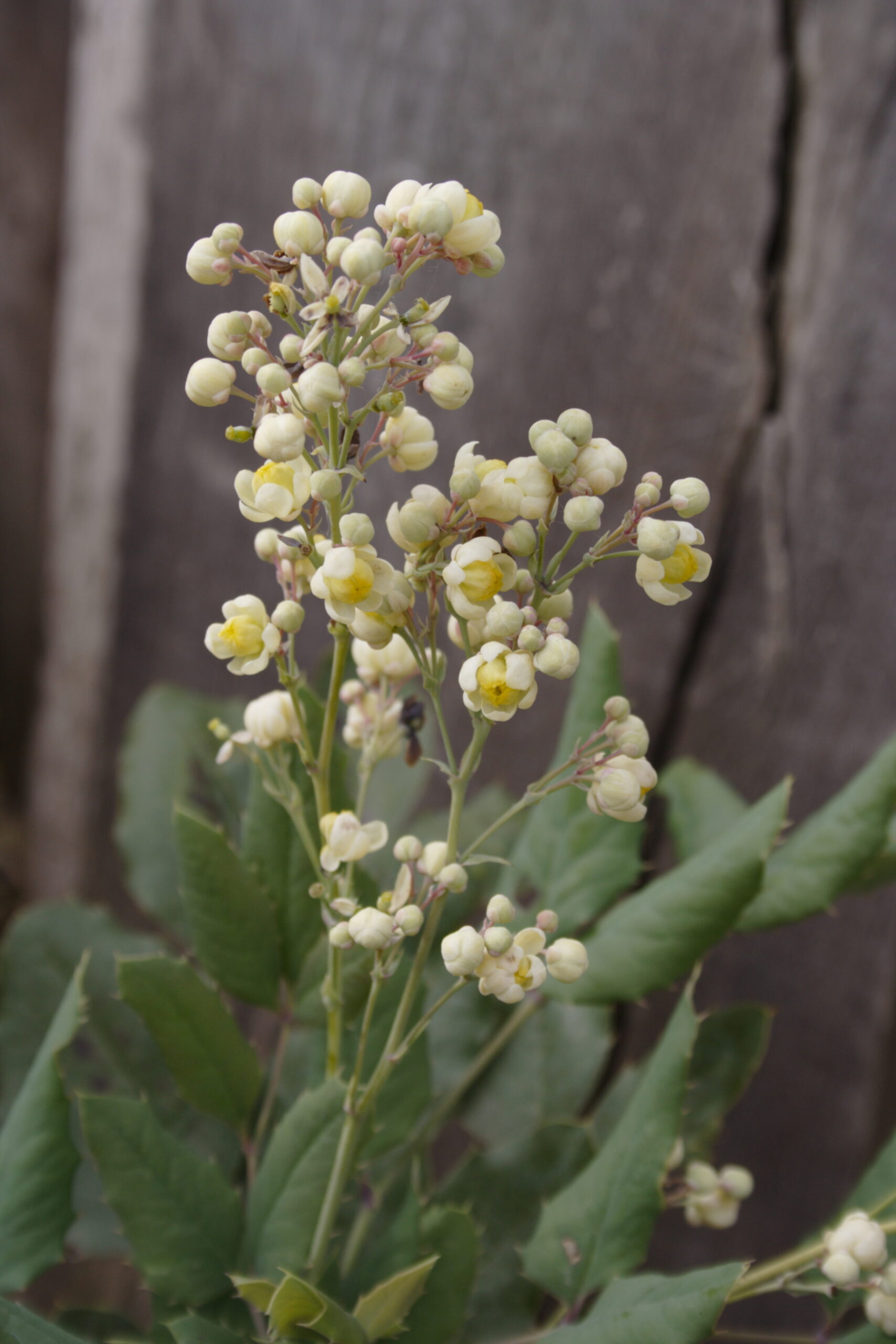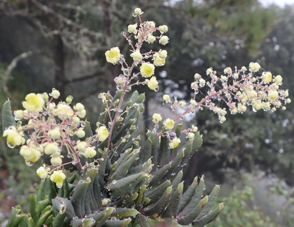 A rather distinct form of this rare Mexican species we found in Queretaro in 2004 growing to only 1m or so high on very dry rocky outcrops, the leaflets curling strongly at maturity to give a unique look. Related to M. pallida and like it relatively low growing with fairly short racemes of cream, yellow-centred flowers seen over a long period in spring or other times of year, followed by bloomy black fruit. This may get taller in cultivation here, possibly to 2m+. Hardy, for full sun or semi-shade and very drought tolerant.