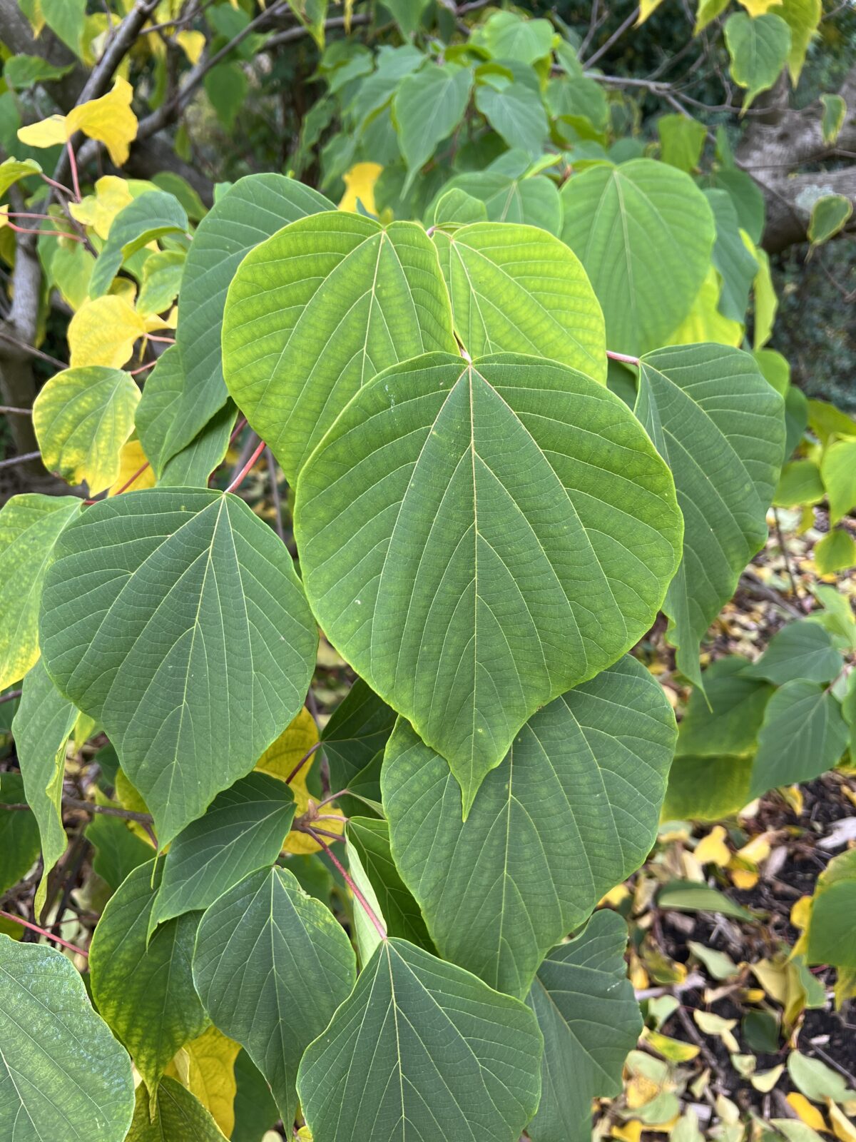 A great foliage plant for a reasonably sheltered position, this very rarely encountered large shrub or small tree from the Far East is principally grown for its handsome leaves. New foliage emerges covered in fine hair and starts deep red, turning through soft brown to green. Male and female flowers on separate plants, the females in large creamy panicles.