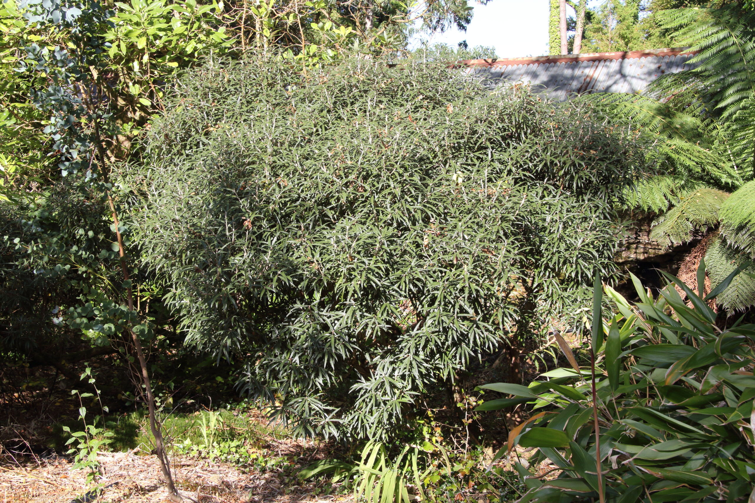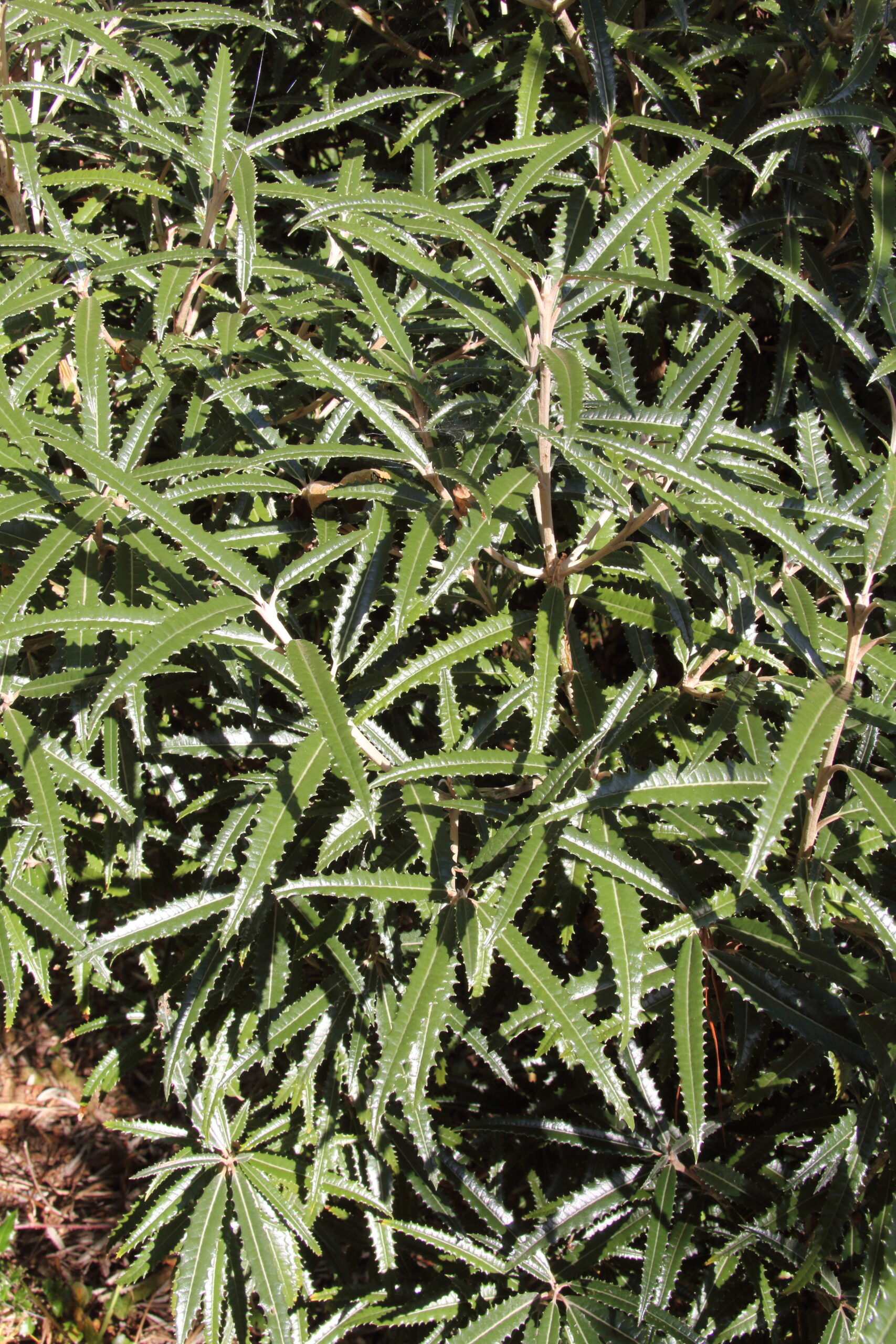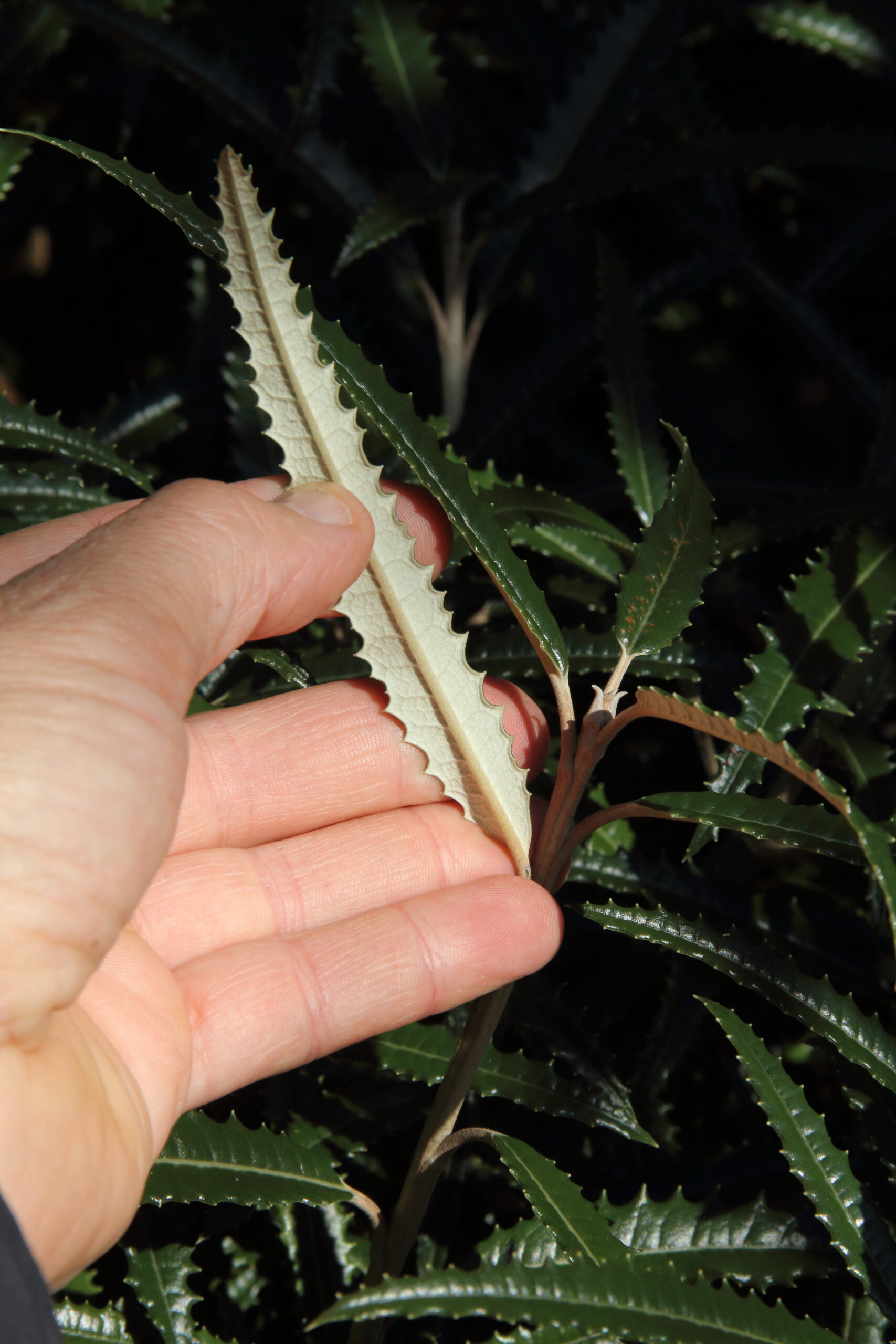 This excellent foliage plant will make an evergreen rounded shrub eventually to about 2m tall, with narrow, pointed, sharply toothed, olive-green leaves, white underneath, and pale-brown hairy stems. It is superb for exposed seaside gardens, and also does well much further inland, unless you're very cold.