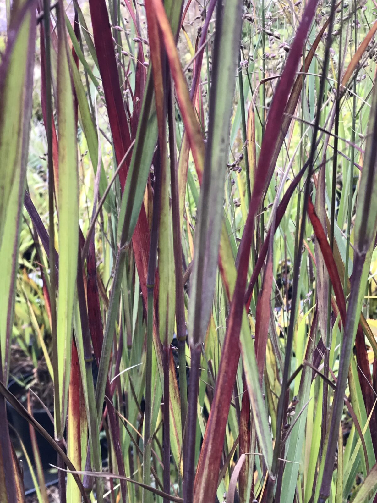 A very fine form of the American Switch grass, with an upright habit to 80cm and light blue-green foliage that starts to colour with deep-red in summer and turns to the richest burgundy in autumn. Diffuse red-tinted flower heads from August until November. For a sunny, not overly crowded position in well drained soil; best grown lean and fairly dry. Very hardy and clump forming.