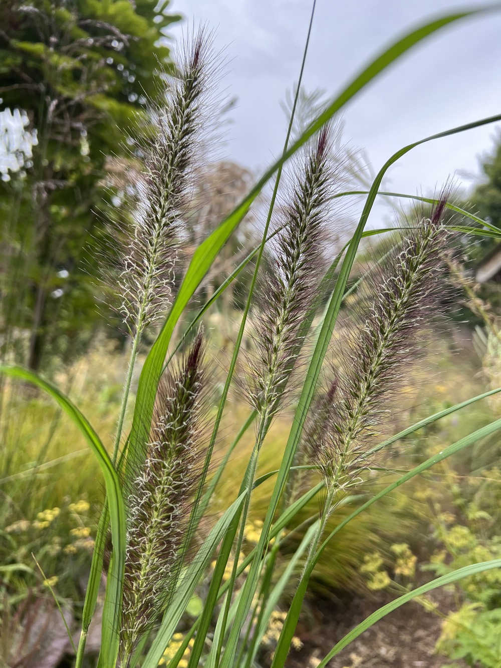 A very impressive and exceptionally dark form of Fountain grass, making rounded clumps of arching foliage. The fluffy 'tails' of flower are a deep blackish-purple and stand above the foliage from late summer into autumn. 1m. For a light, well drained soil in sun; not too excessively dry. Hardy.