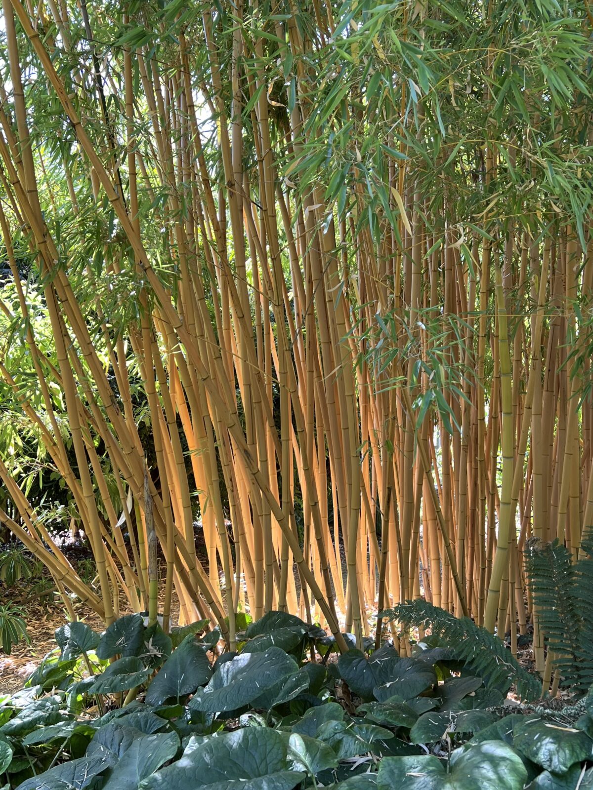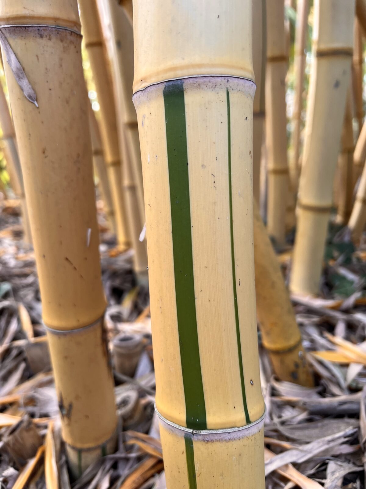 Truly marvellous and jaw-droppingly impressive when mature, which doesn't take long from a small plant, as the huge thick culms seem to arise from nowhere. They are a rich warm-yellow with random deep-green vertical stripes, and the foliage is elegantly drooping and held high. Up to 6m or possibly more if very happy. Vigorous. This is a running bamboo so in most situations requires a rhizome barrier, which is very easily installed. Please enquire for method.