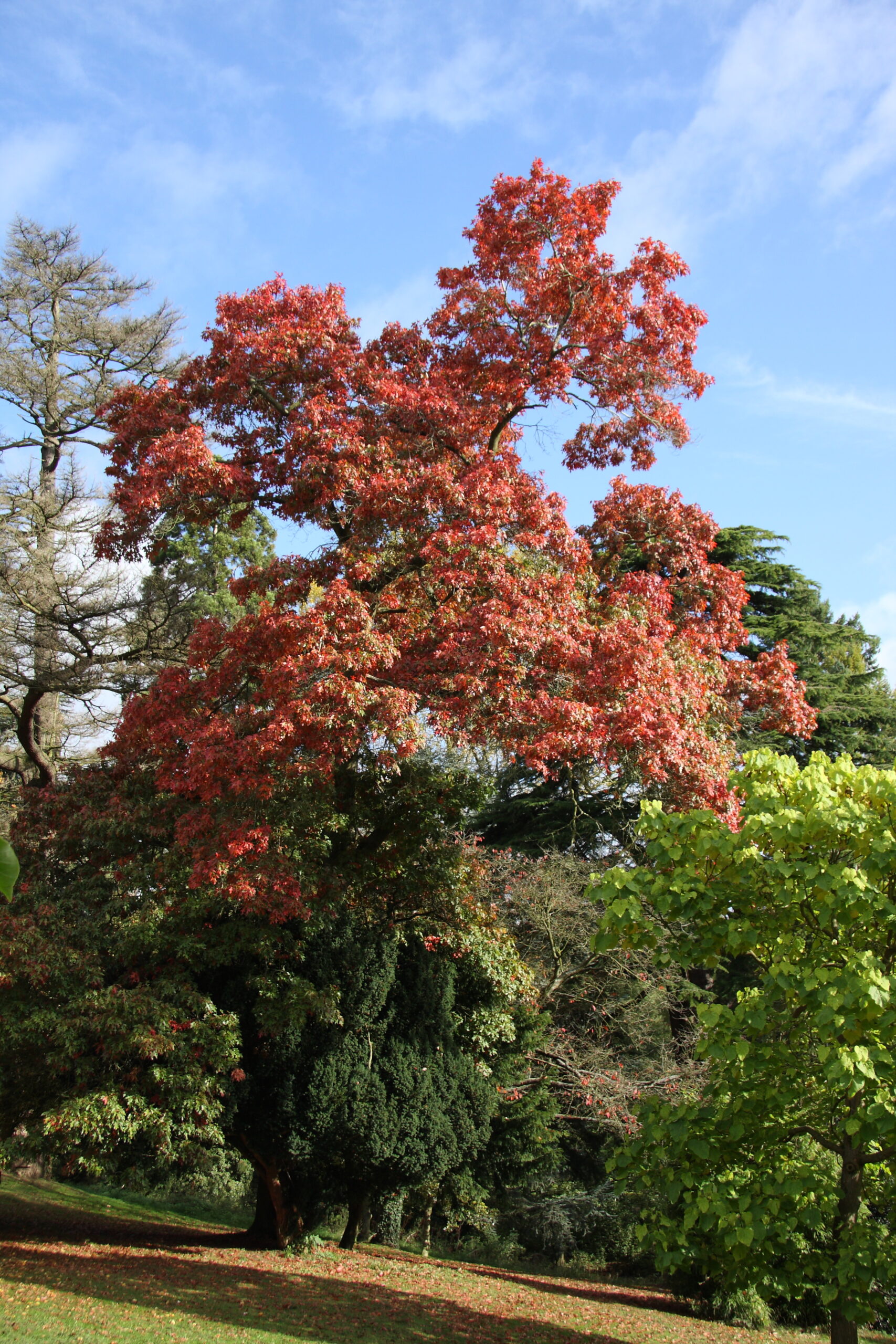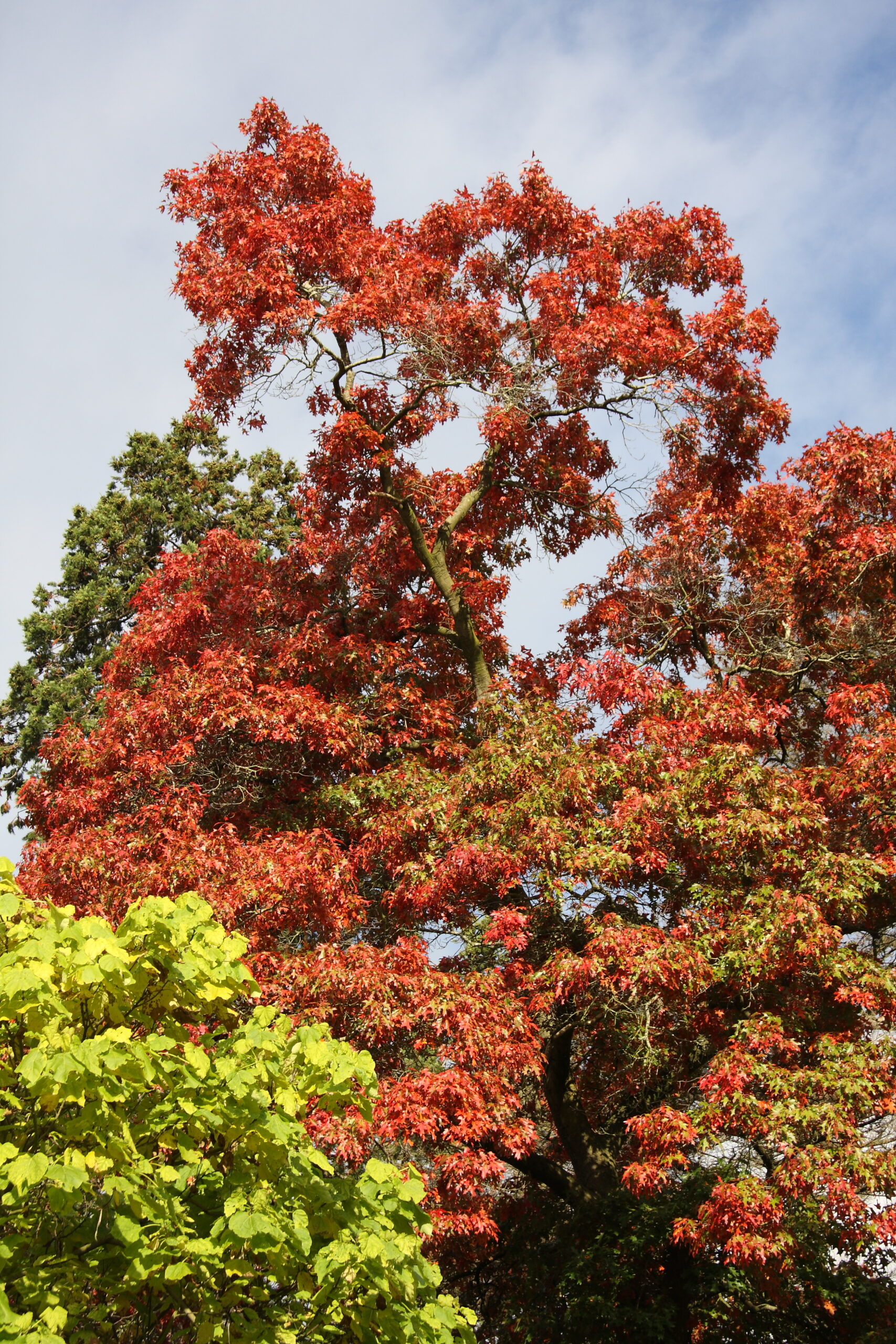 This selected form of the N American 'Scarlet Oak' is a magnificent sight when the very beautiful, deeply lobed foliage turns to a rich, glowing scarlet in the autumn sunlight. If only this and other exceptional American oaks were planted more often, to achieve more large bright-red autumn colouring trees in our gardened landscapes. Fast growing on most soils apart from thin alkaline, making a grand specimen eventually. I have a distinct memory of walking past a specimen of this in a local park as an unknowing child and being rather taken aback by its leaf shape and colour.