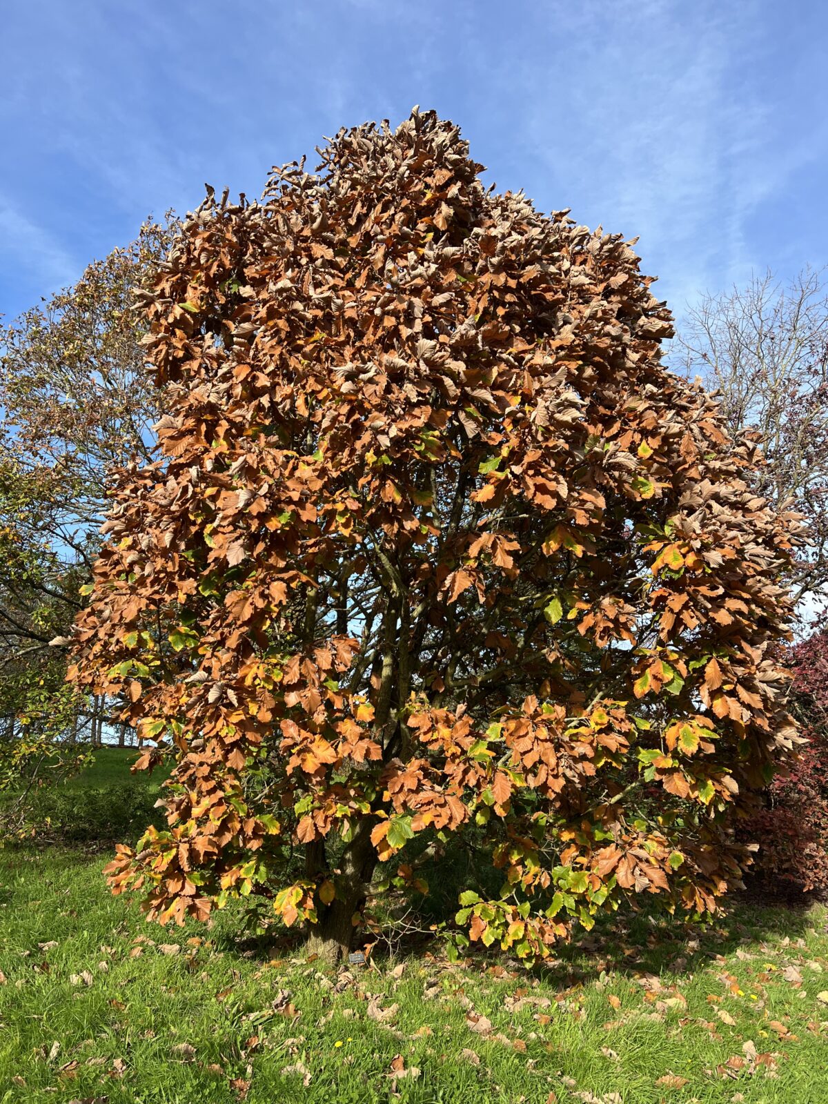 A hybrid between too very distinctive, impressive and desirable species; Q. pontica and Q. dentata, both of which have particularly striking foliage and the combination doesn't disappoint. Large, obovate, well toothed leaves are a glossy dark green above and grey beneath, turning orange-brown in autumn. Makes a small tree of full rounded form with thick twigs. Originally raised at Arboretum Trompenburg, The Netherlands.