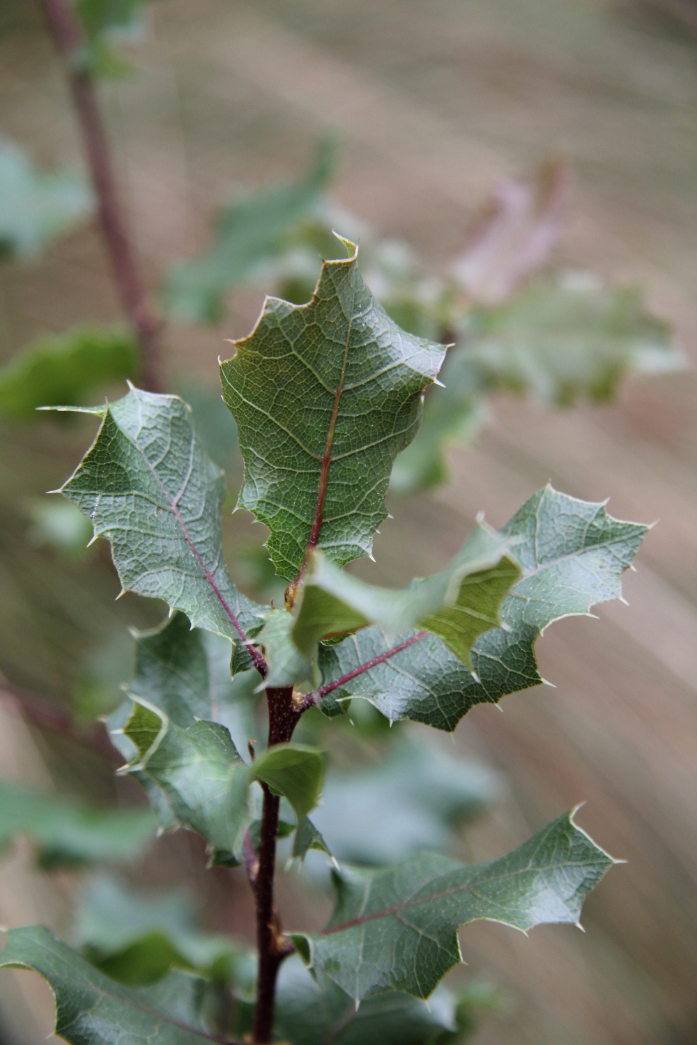 A shrubby variety of the Interior Live Oak, a Californian evergreen species, making only a medium to large shrub over time. The foliage is spine edged and very similar to the Mediterranean Kermes oak, Q. coccifera. The male flowers in catkin-like structures are red in bud and open yellow in summer. Very drought tolerant, this sun loving scrub oak would suit xeric plantings composed of other Mediterranean and dry climate plants. Hardy and perfectly suited to a warming UK climate with potentially very dry summers.