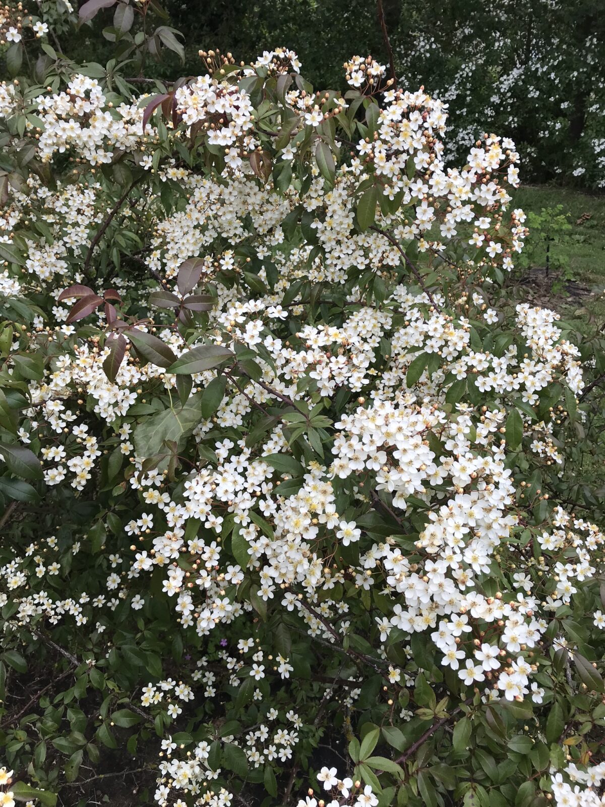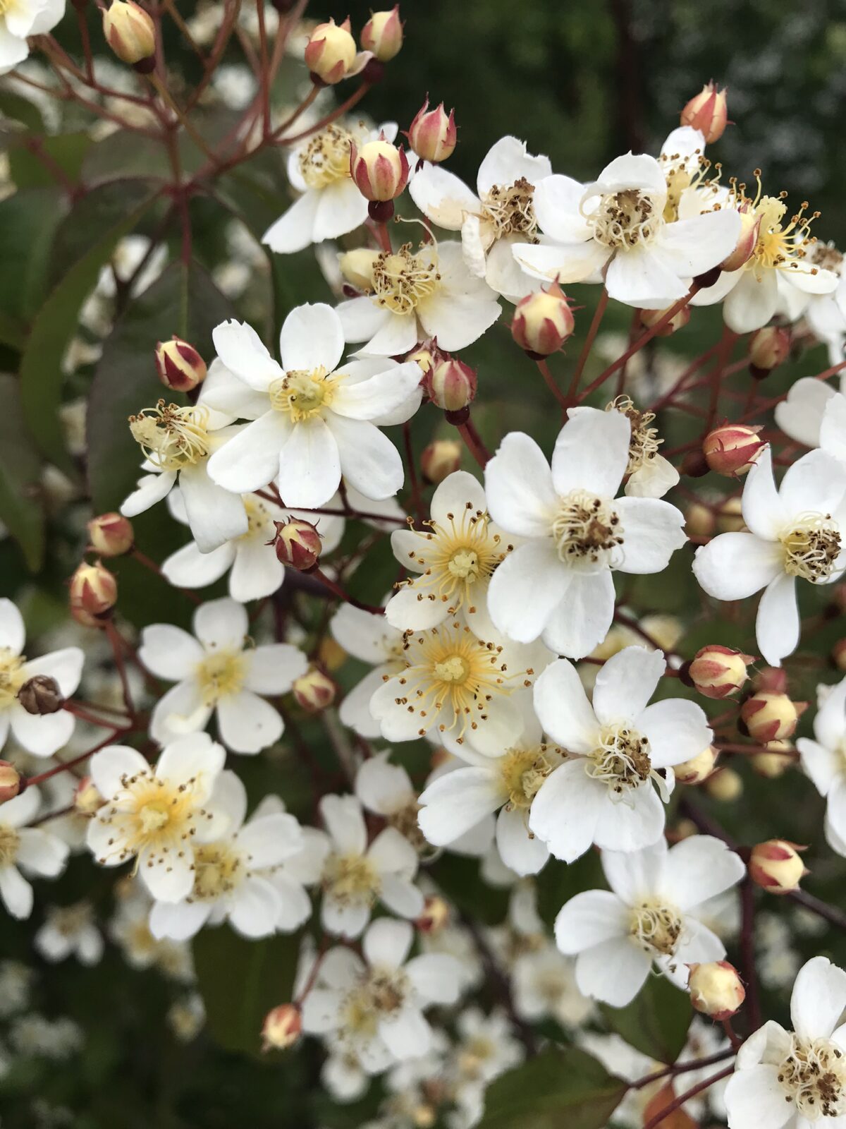 A highly attractive and rather distinct species with flattened domes of tiny creamy-white fragrant flowers with conspicuous yellow stamen in May/June. Found originally at the roadside at 1200m in north central Guizhou, China, this made a climbing rose with clusters of small red hips. New growth is red tinted. For a sunny wall; I've found this species completely hardy here in my cold inland frost pocket and it also does extremely well at David Austin's in the Midlands.